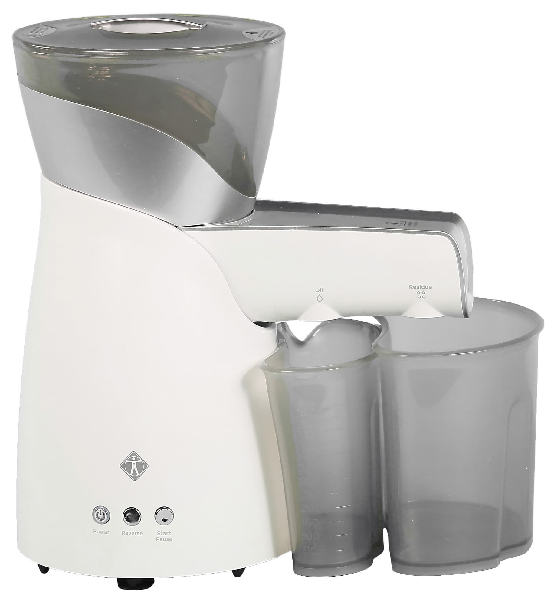 Контейнеры узкие, при хранении их удобно располагать друг в друге, при этом они занимают совсем немного места. Форма эргонометричная, емкости удобно и надежно, без риска выскальзывания, размещаются в руках. Дополнительно в комплект к маслопрессу входят защитная рукавичка и сито, устанавливаемое на контейнер для масла и защищающее готовый продукт от попадания фрагментов жмыха.