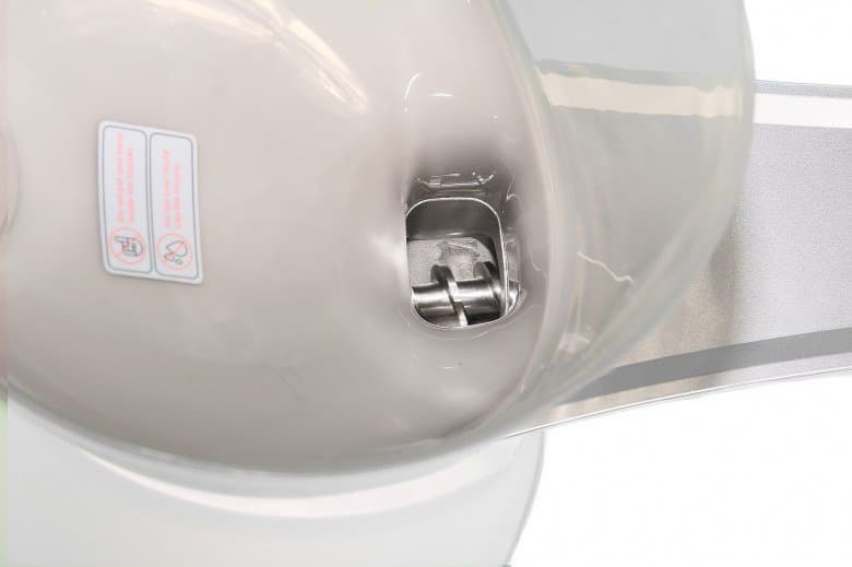 После вставки шнека в предназначенный для этого металлический паз в корпусе двигателя, надевается отжимная корзина. Фиксатор байонетного типа закрепляет конструкцию на корпусе.