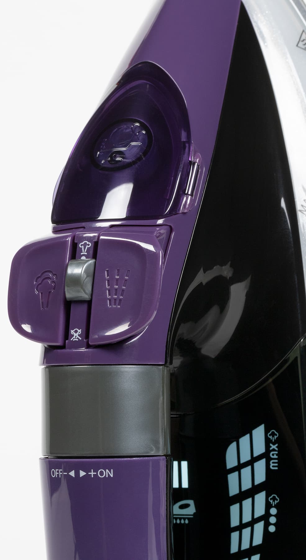 Для комфорта пользователя устройство оснащено гибкой регулировкой постоянной подачи пара, мощным паровым ударом, разбрызгивателем, гладкой керамической подошвой правильной конструкции, позволяющей разглаживать труднодоступные места на одежде, и системой автоотключения при бездействии.