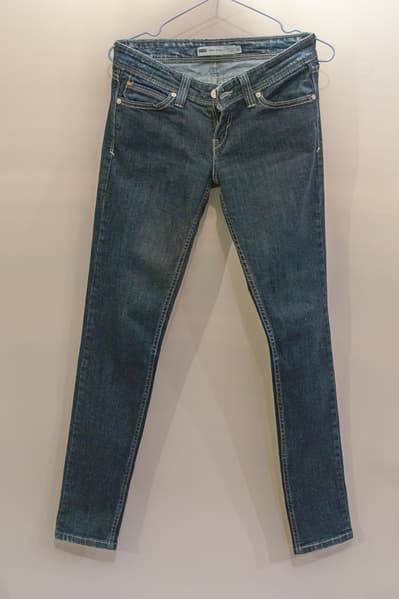 Джинсы из очень плотной ткани при стирке в машине были измяты отжимом на высоких оборотах и дополнительно пересушены на батарее.