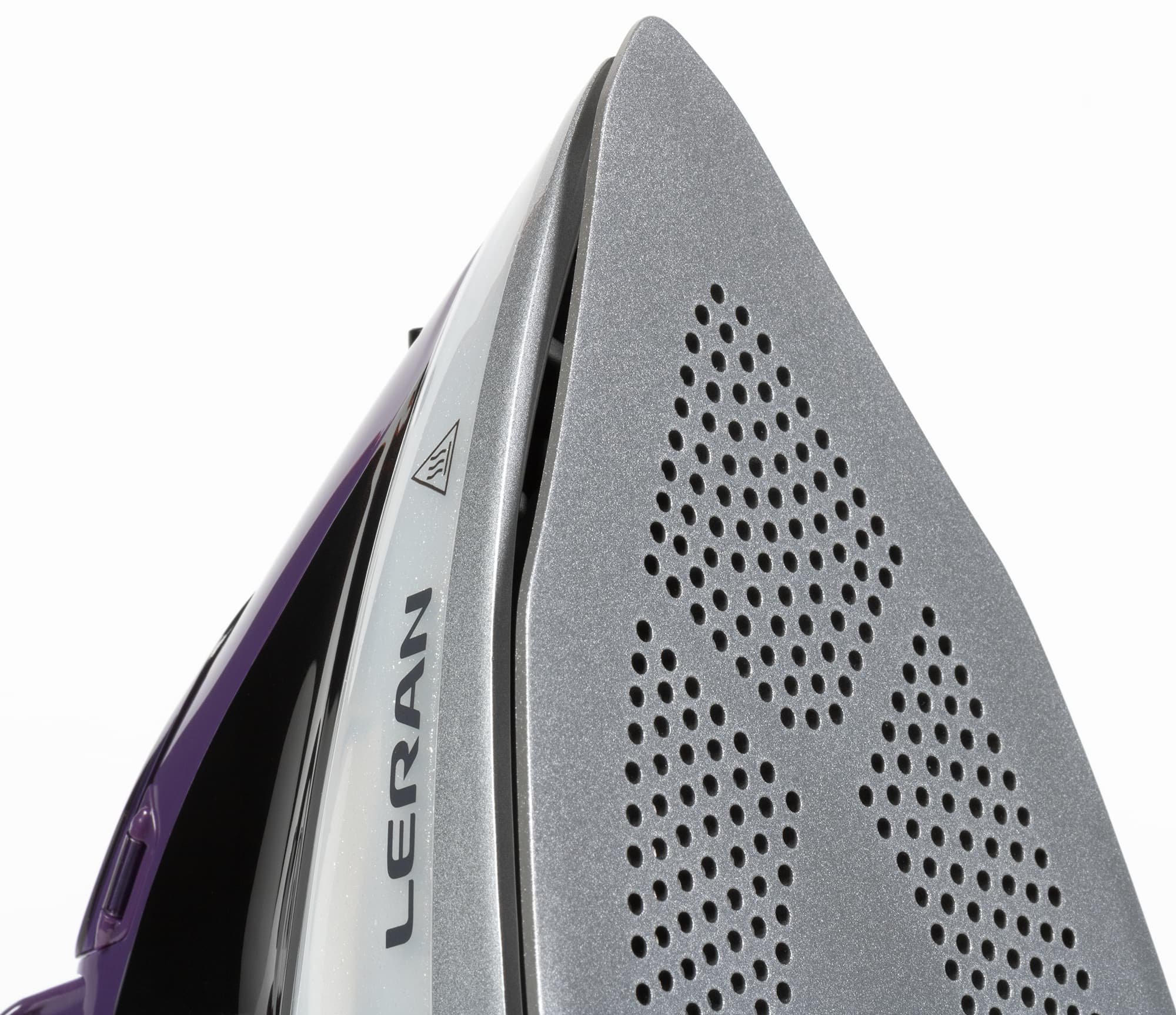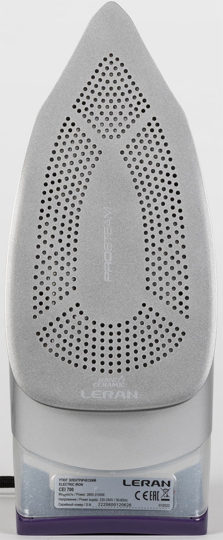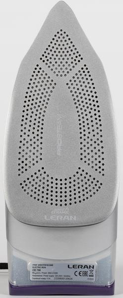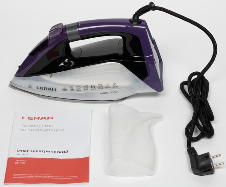 Конструкция Leran CEI 700 классическая: корпус со встроенным резервуаром для воды, гладкая подошва и ручка с элементами управления. В оформлении корпуса использован пластик черного, фиолетового, серого и серебристого цветов. Размеры утюга стандартны. Вес не самый легкий — 1,32 кг.