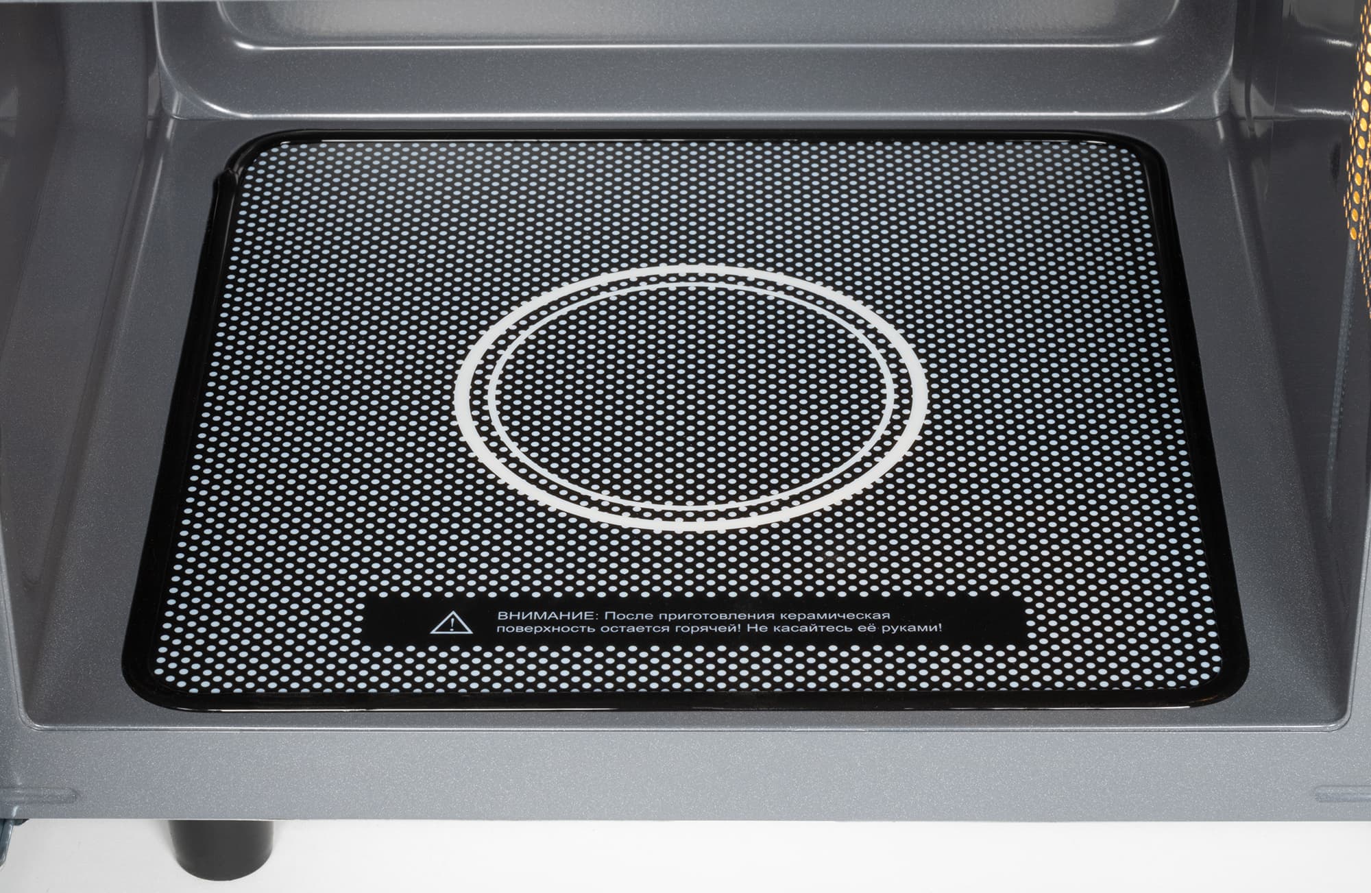 Форма камеры традиционна для СВЧ-печей, за исключением поворотного механизма. Вместо него на дне располагается керамическая поверхность размером 25×26 см с резиновым уплотнителем по периметру. Под рабочей поверхностью находится магнетрон.