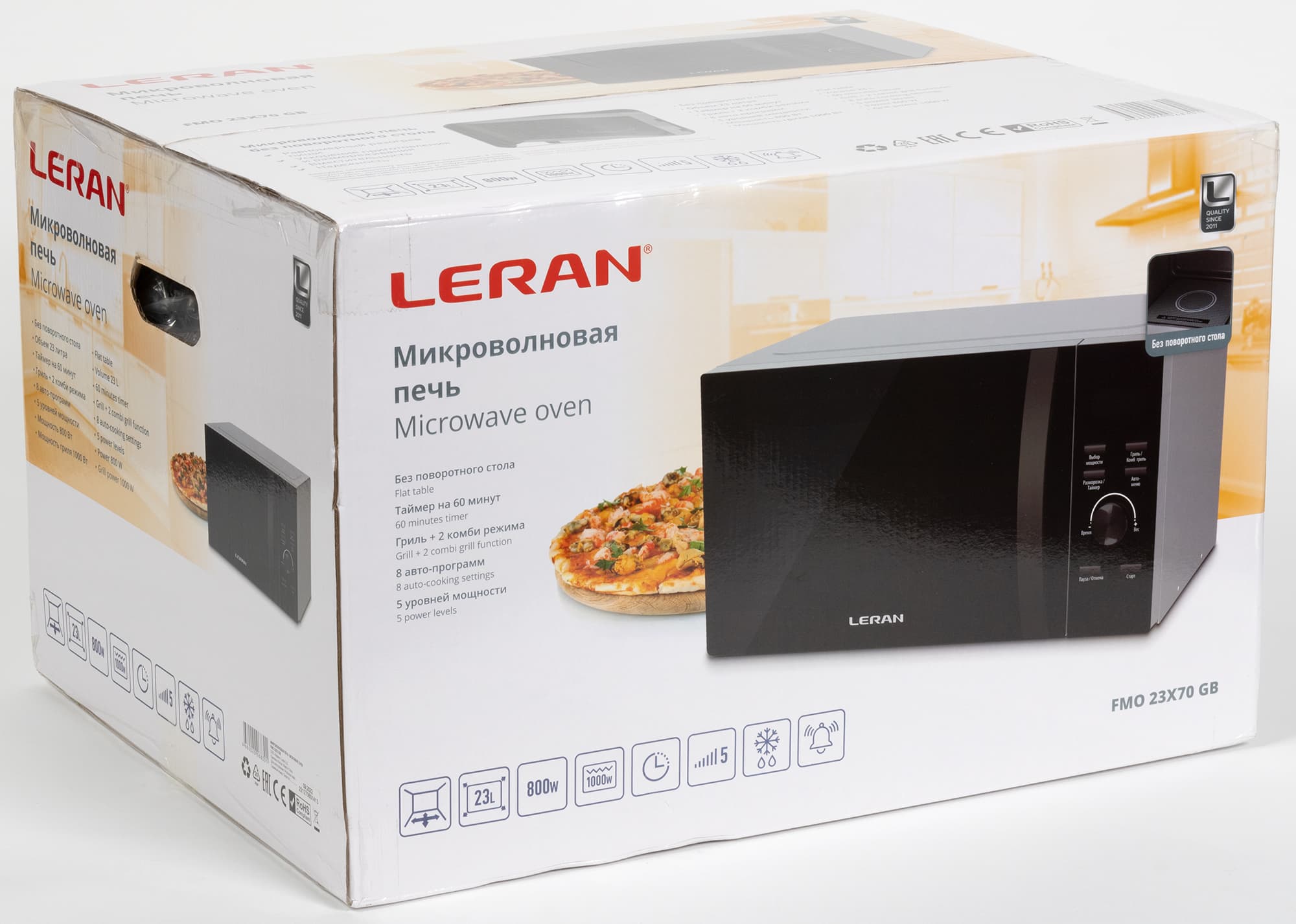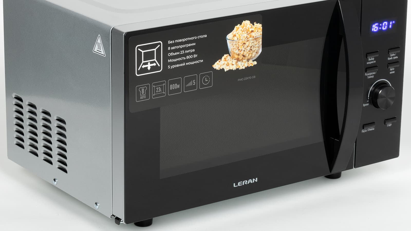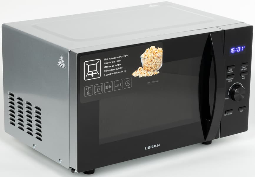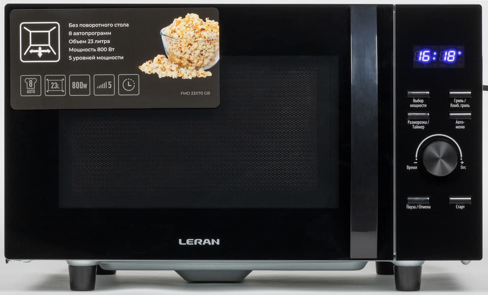 Leran FMO 23X70 GB — отдельностоящая микроволновая печь без встроенного поворотного стола с 5 режимами мощности и функцией гриля, как самого по себе, так и в сочетании с микроволнами. В распоряжении пользователя 8 автоматических программ, 3 режима авторазморозки, а также возможность задать параметры поэтапного приготовления блюда до 4 шагов.
