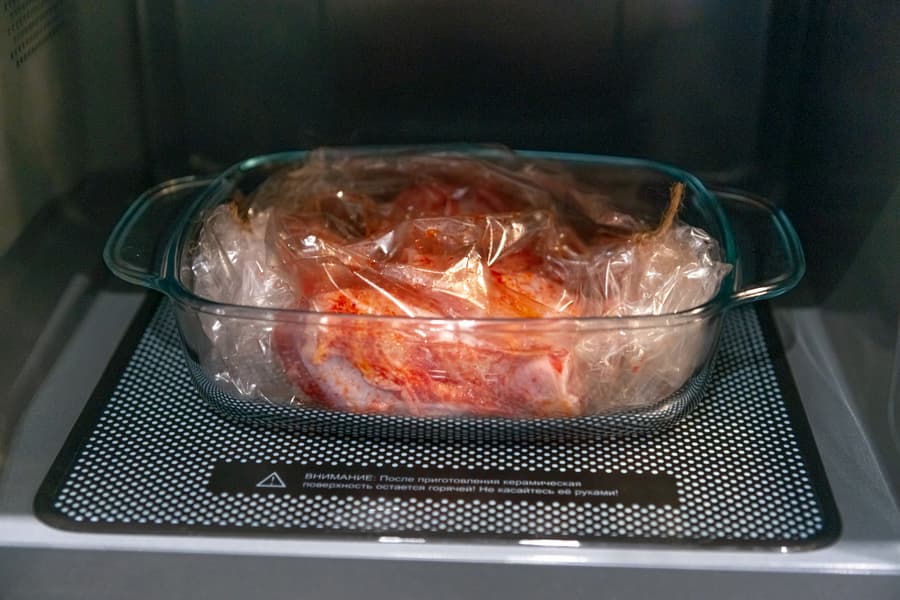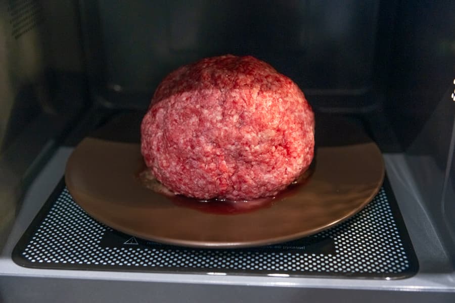 Сняли размягченную массу и вернули фарш обратно. Печь продолжила разморозку. Еще через 8 минут снова раздался сигнал, мы приостановили работу микроволновки и проверили ситуацию. Фарш сверху и по бокам был уже мягким, мы снова счистили размороженную часть и вернули кусок назад. Таймер показывал 8:30 до окончания разморозки. За это время кусок весом около 400 г разморозился полностью. Поджаренного фарша в нем больше не обнаружилось.