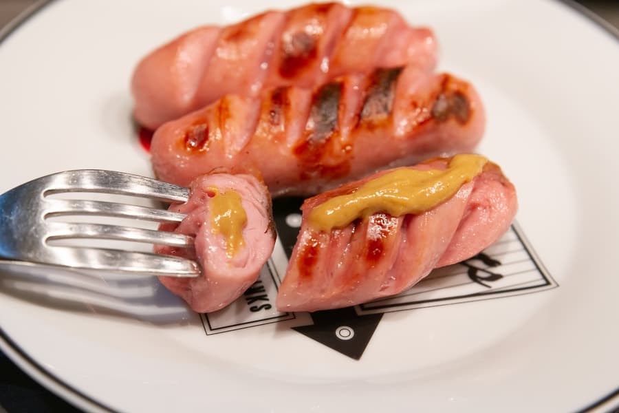 Этот тест повторяет предыдущий, с той разницей, что гриль мы использовали на втором режиме. Снова установили два этапа: микроволны на мощности 80% в течение 4 минут и микроволны плюс гриль (G-2) еще на 4 минуты. Сосиски надрезали и уложили на металлическую решетку.