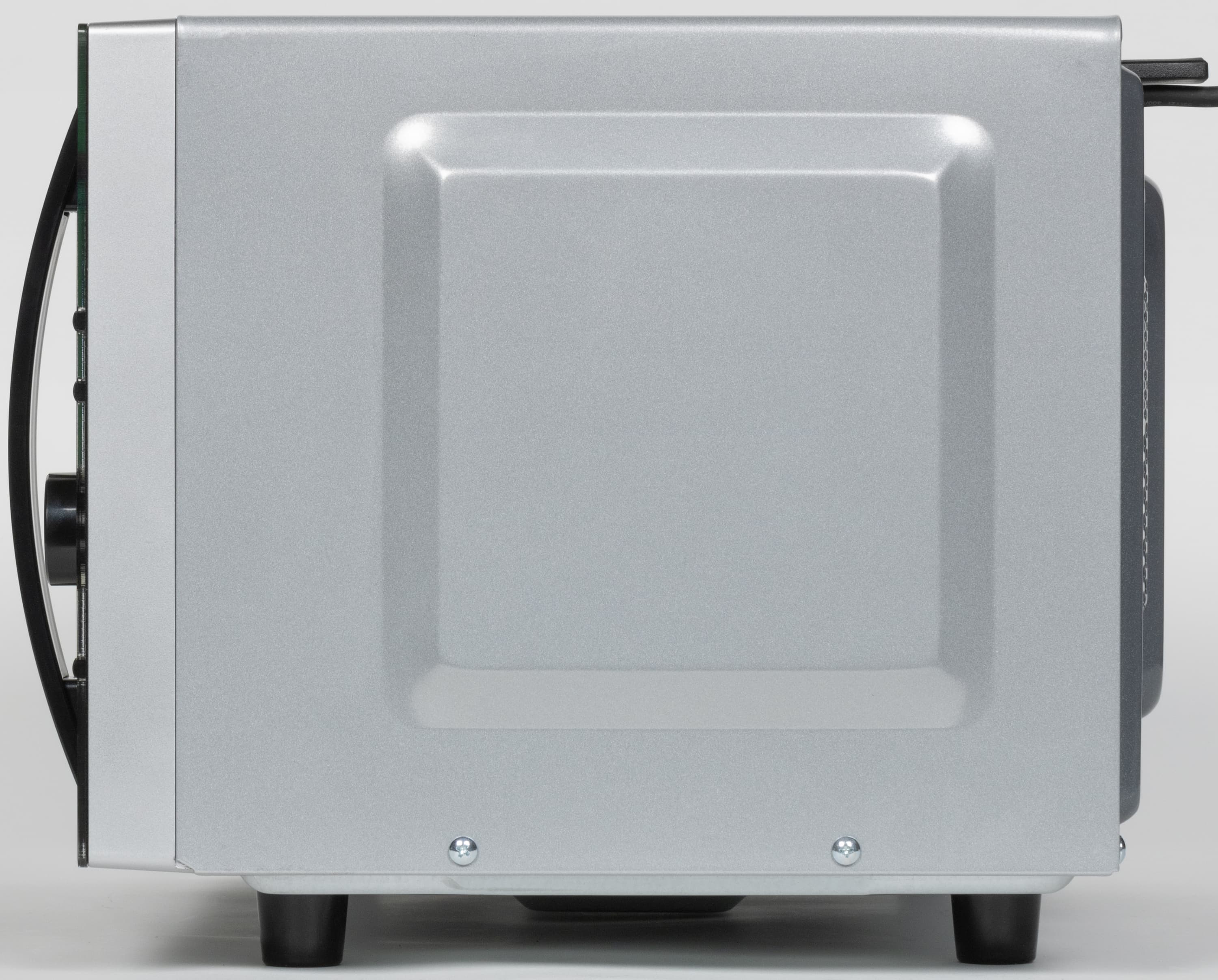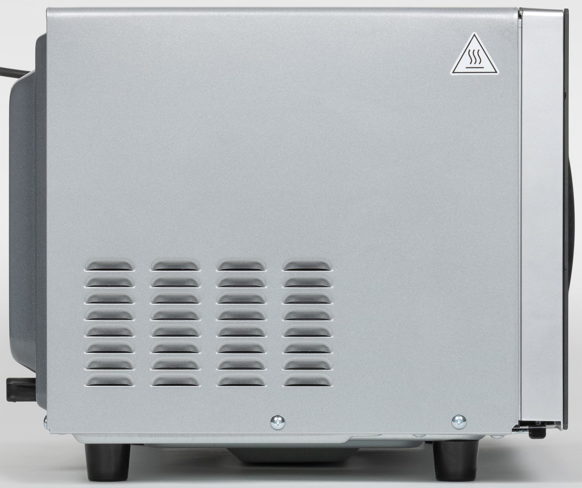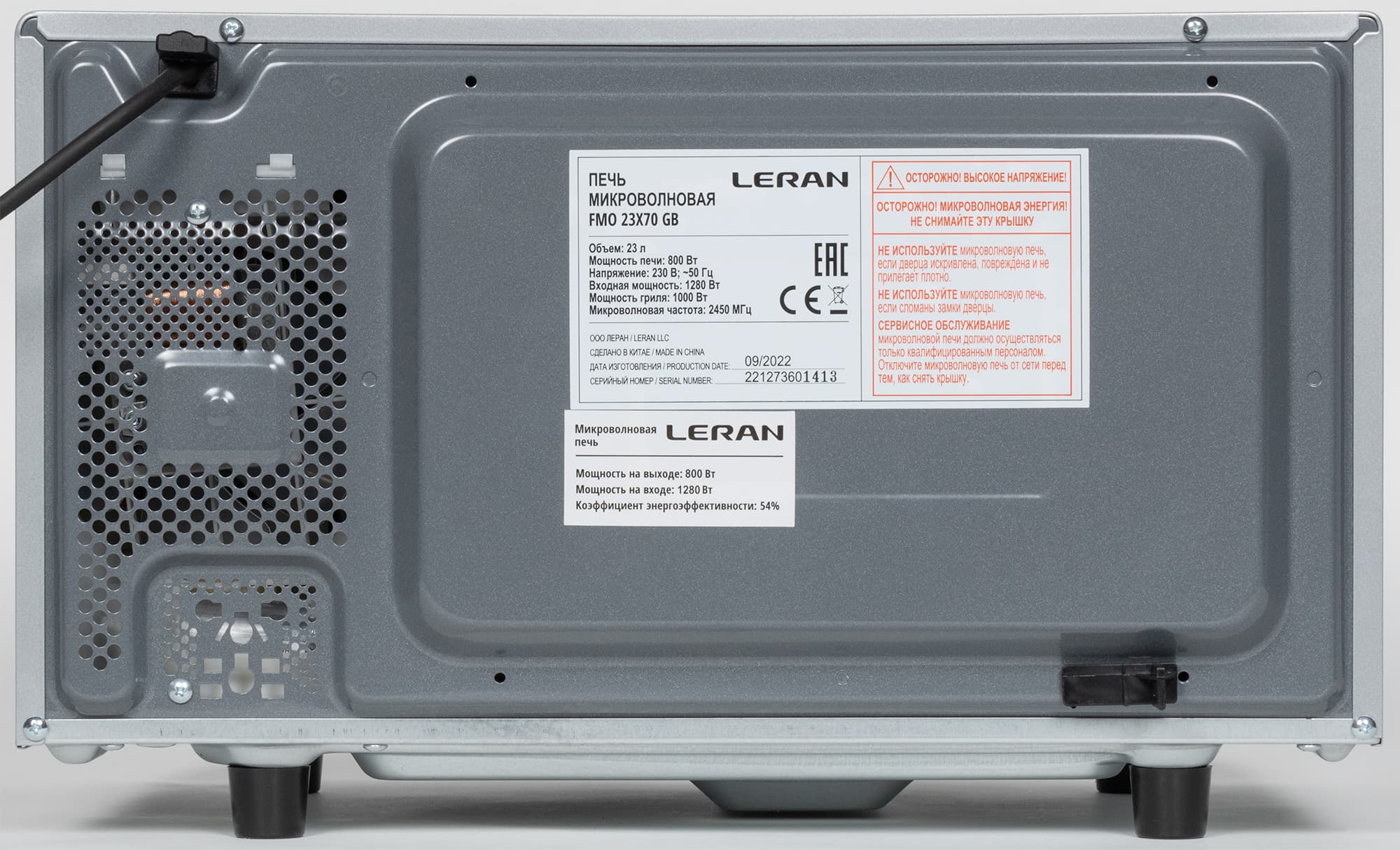 На задней стенке корпуса мы видим вентиляционные отверстия и наклейки с технической информацией. Слева вверху выходит шнур электропитания длиной 85 см. Место соединения шнура с корпусом оснащено ограничителем, не позволяющим поместить печь вплотную к стене.