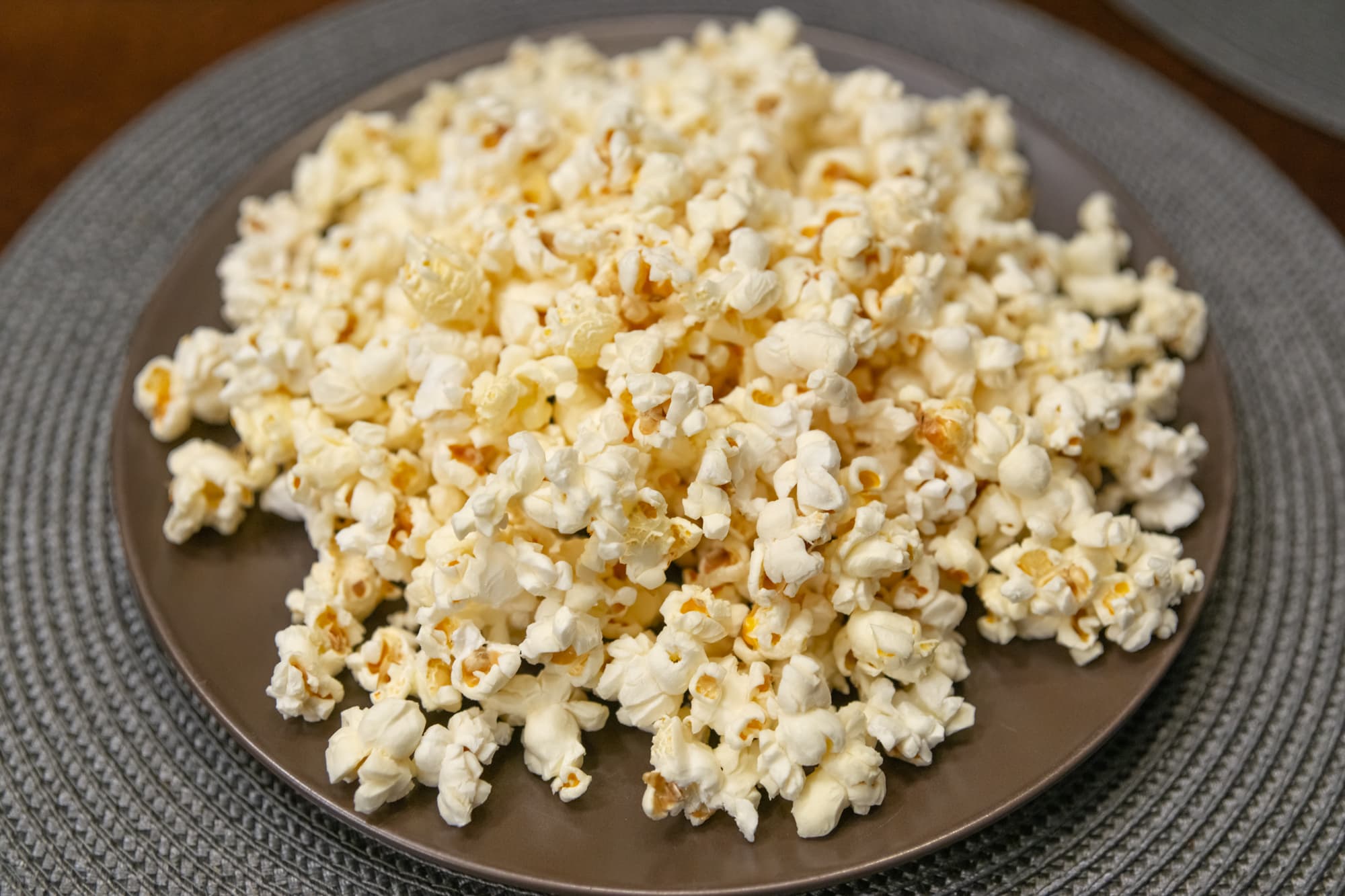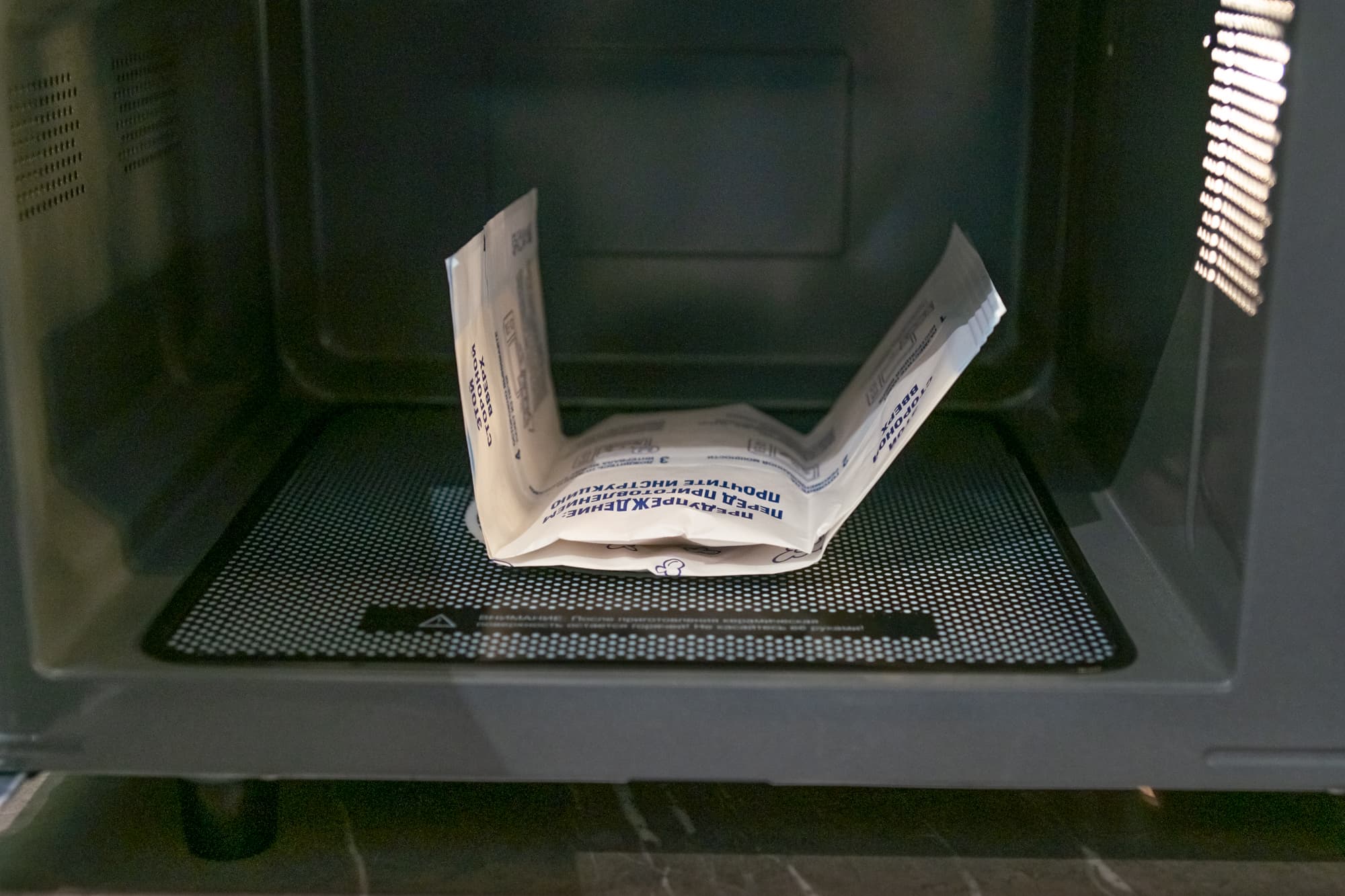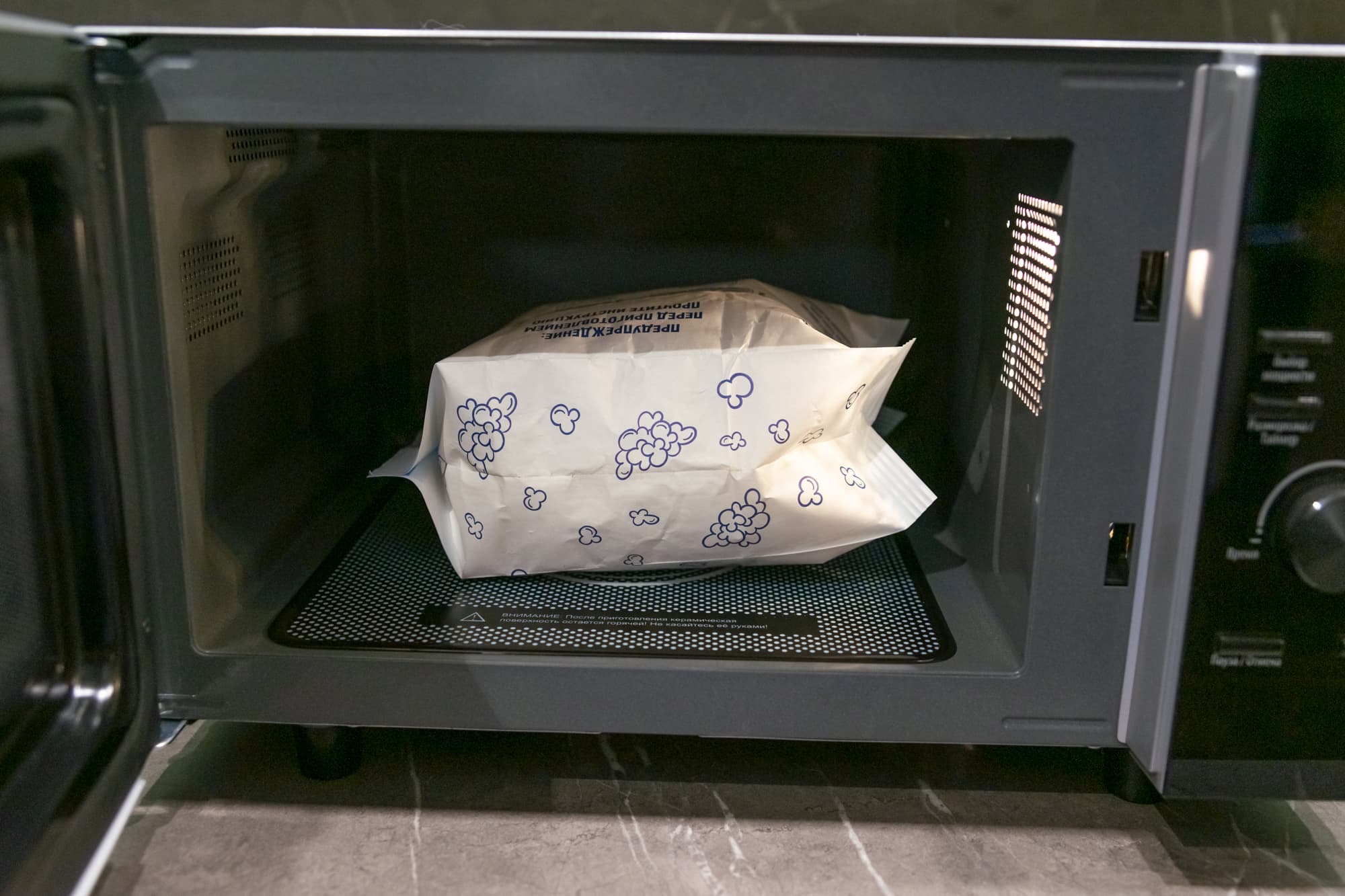 Примерно через 1,5 минуты стали раздаваться характерные хлопки взрывающихся зерен. Пакет постепенно увеличивался в размере, а вокруг микроволновки распространялся аппетитный аромат. После финального сигнала мы извлекли пакет и высыпали попкорн на тарелку.