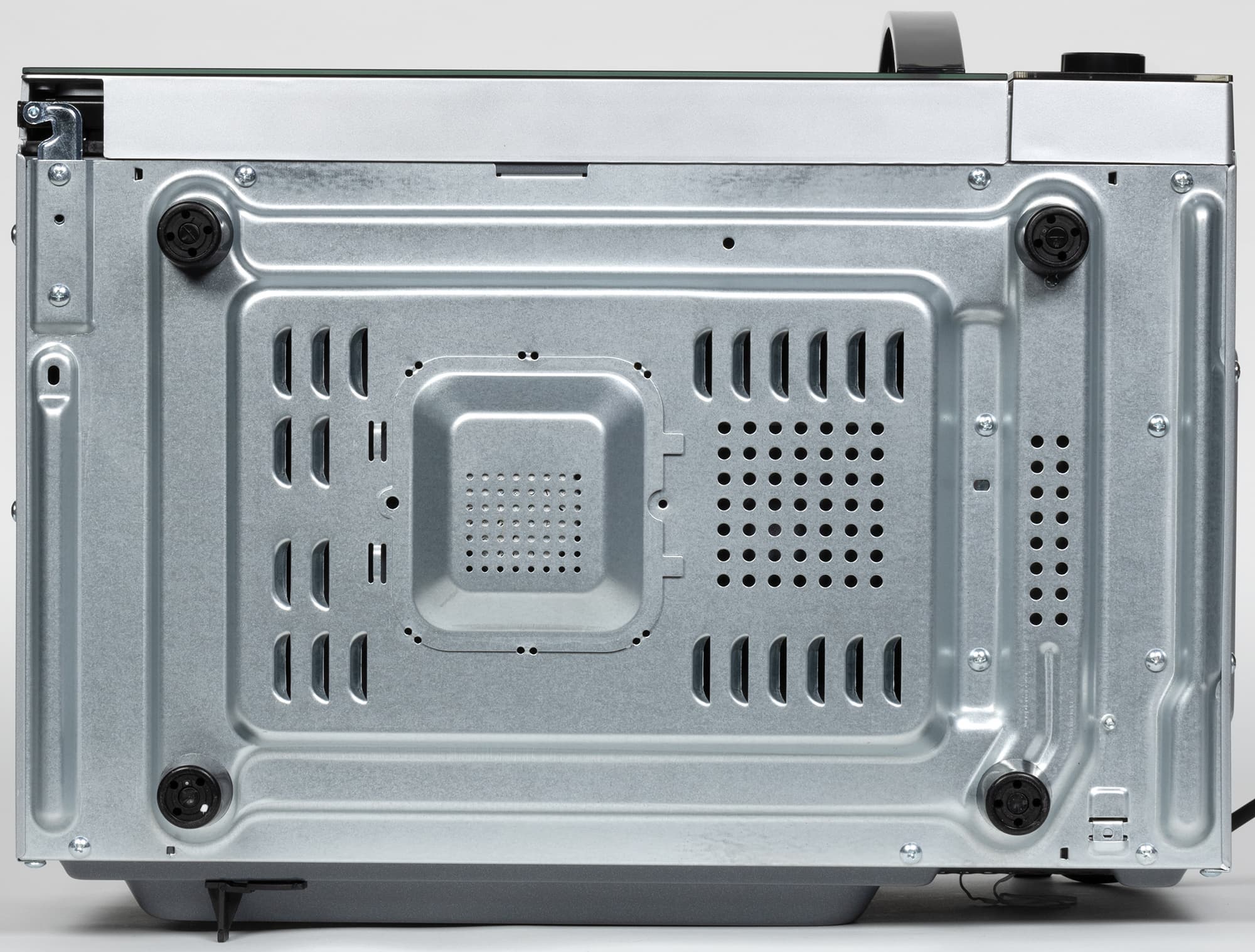 На дне прибора снова вентиляционные отверстия и четыре пластиковые ножки без резиновых вставок высотой 2,5 см. Корпус стоит на столе крепко и при открывании дверцы не сдвигается.