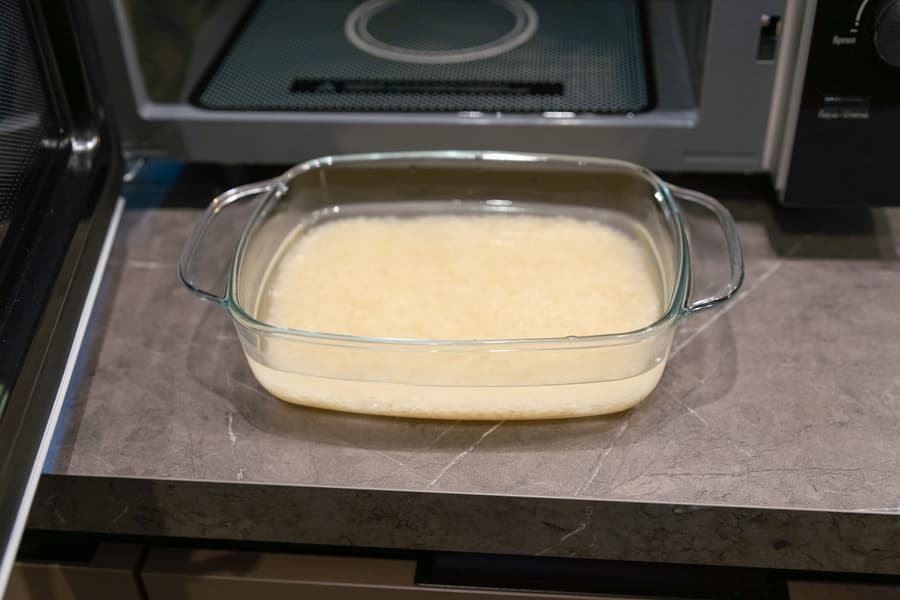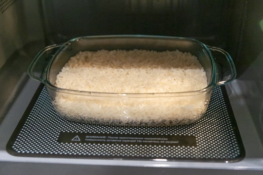 Чтобы выяснить, насколько правильно рассчитана автоматическая программа по приготовлению риса, мы взяли 200 г промытого зерна, залили 400 мл воды и поместили стеклянную емкость в печь.