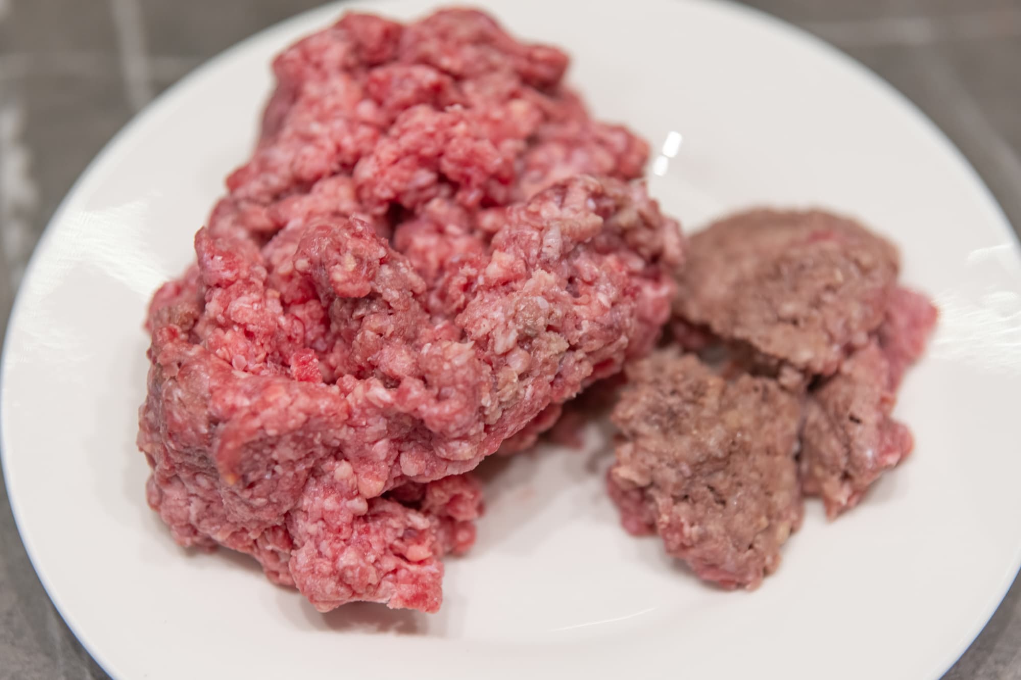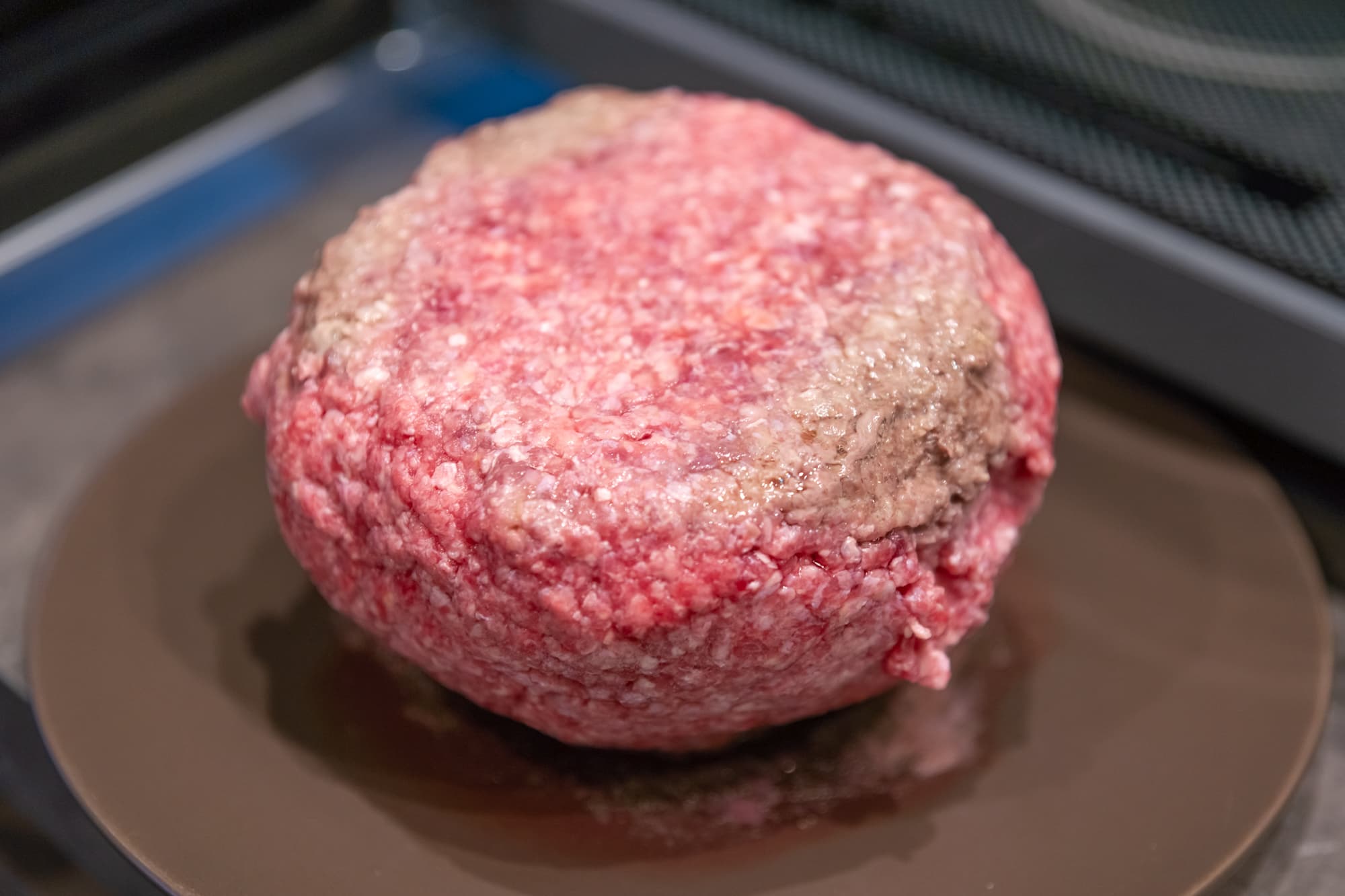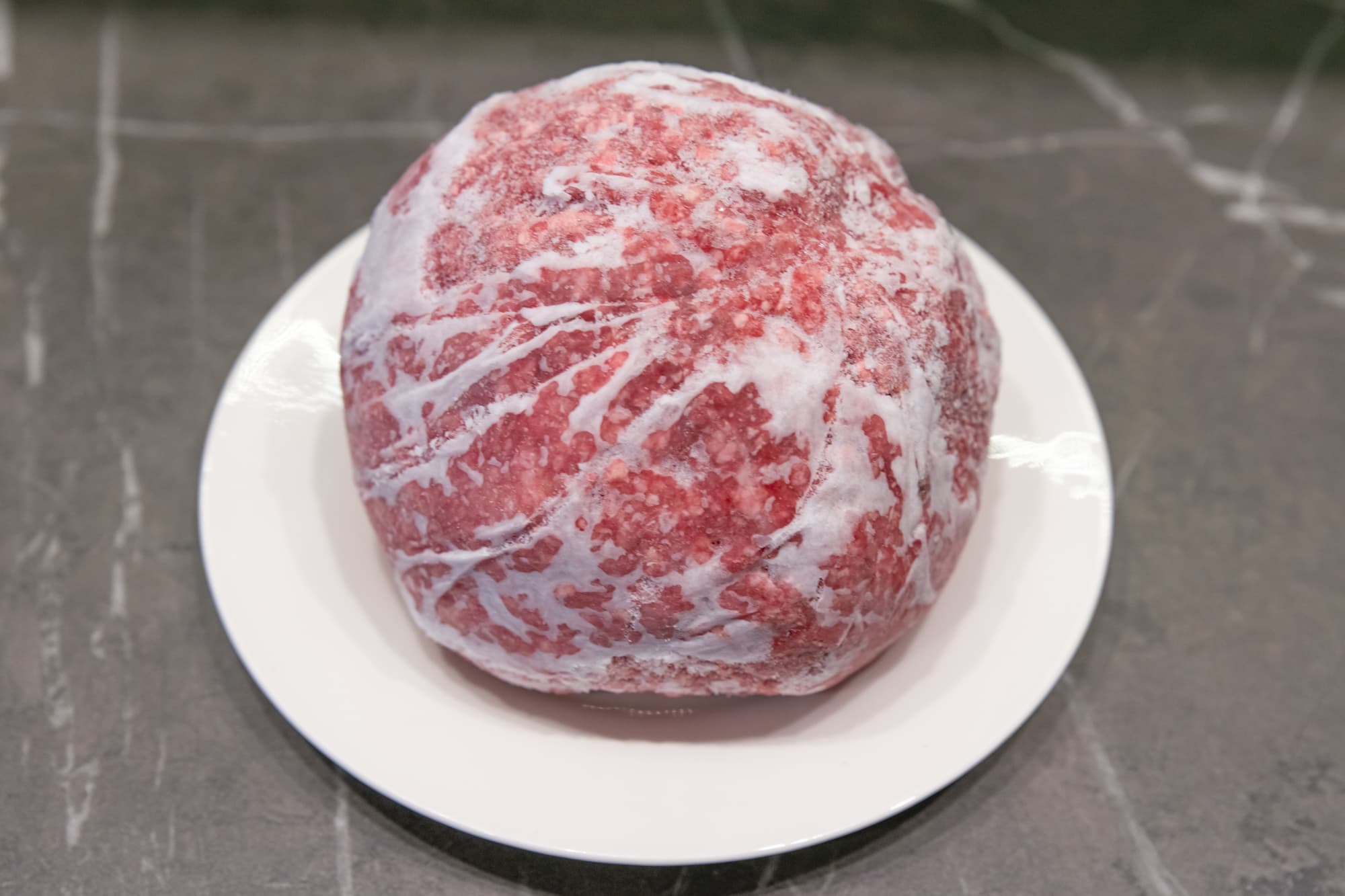 Верхняя и боковые части уже выглядели размороженными, а перевернув кусок, мы обнаружили около 50 г запекшегося фарша.