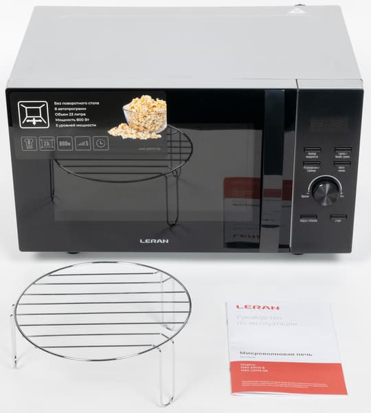 Неоспоримое преимущество Leran FMO 23X70 GB по сравнению со стандартными СВЧ-печами состоит в ее вместительности и простоте ухода за внутренним пространством. Рабочая камера объемом 23 литра без поворотного стола вмещает больше, чем обычная печь. На практике мы убедились, что в этой модели можно смело разогревать и готовить двойные порции за один раз, размещая тарелки на двух уровнях, если использовать подставку для гриля. В печь можно ставить посуду не только круглой, но и квадратной или прямоугольной формы, ограничиваясь лишь размером рабочей поверхности.