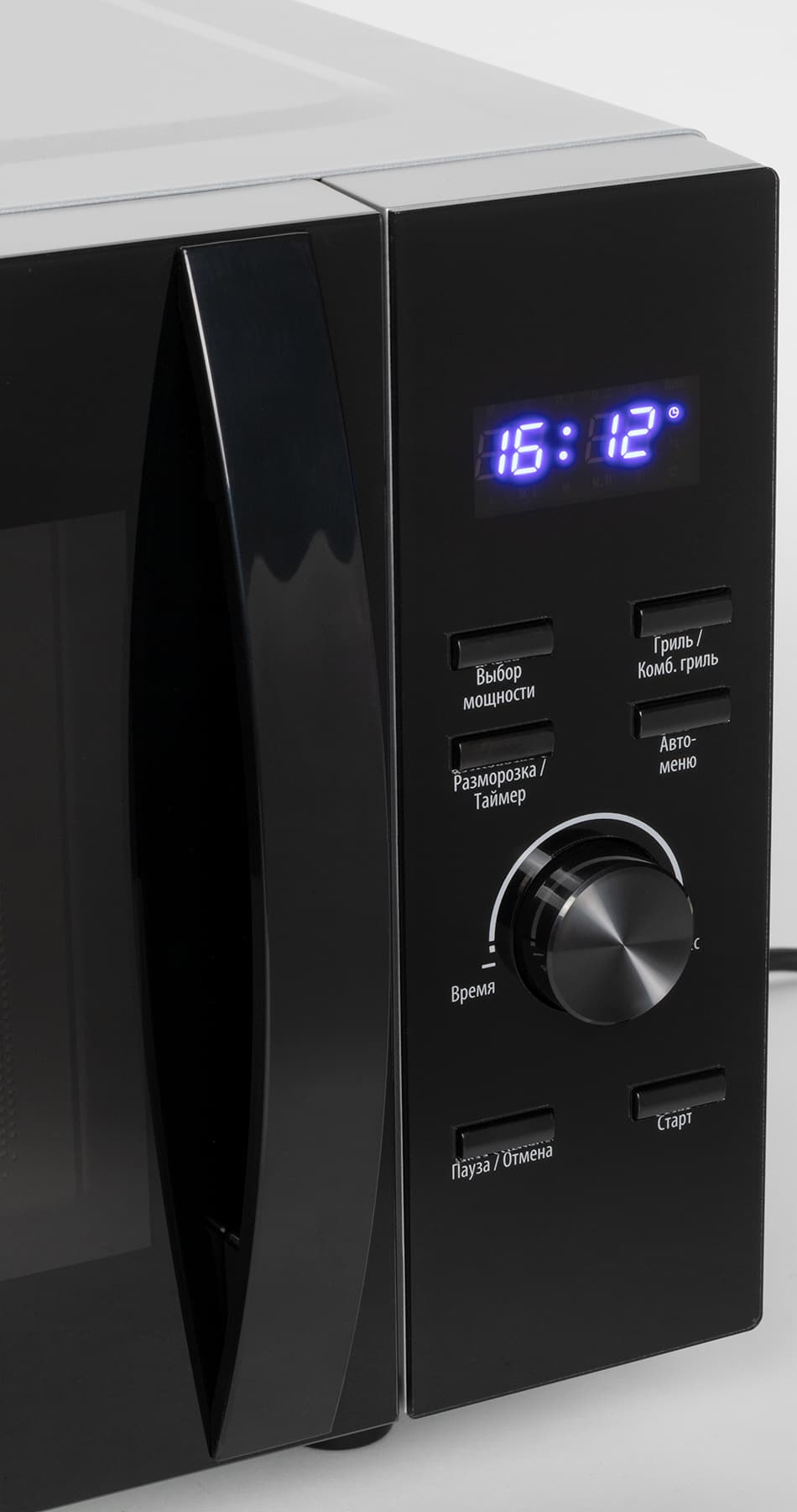 Механические кнопки управления, поворотный тактовый регулятор и небольшой дисплей расположены в привычном месте — справа от дверцы.