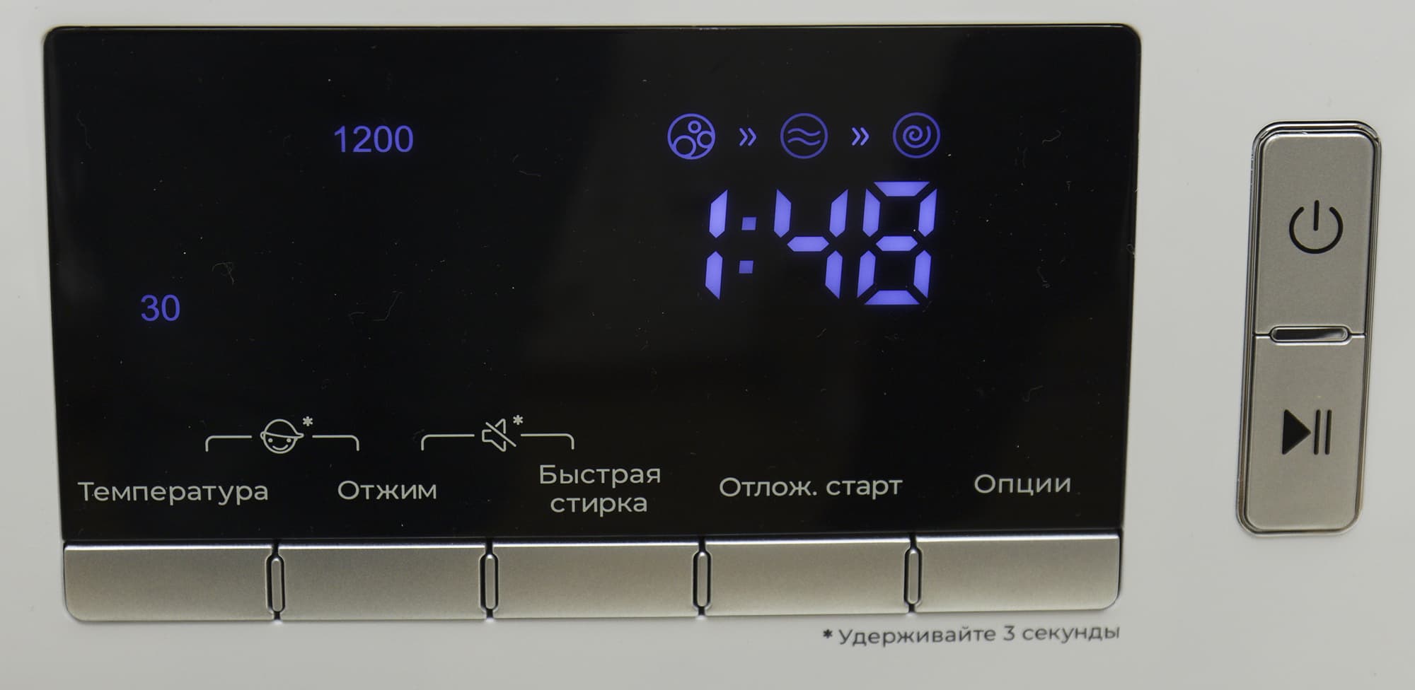 Продолжительность цикла, которая появляется на дисплее при выборе программы, не изменяется в процессе стирки и определяется довольно точно. Время работы стиральной машины не зависит от веса загруженного белья и степени его загрязнения, так как модель не оснащена системой определения веса или датчиком прозрачности воды.