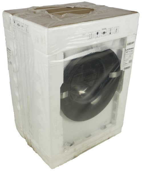 Стиральная машина упакована в пенопластовую коробку, обтянутую толстым полиэтиленом. Какой-либо значимой информации, кроме транспортировочных инструкций, тут нет: индекс модели, серийный номер и краткие технические характеристики размещены, как это принято у большинства современных производителей крупной бытовой техники, на отдельных наклейках.