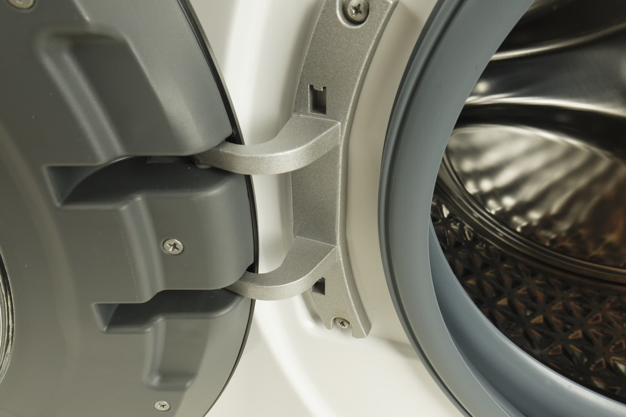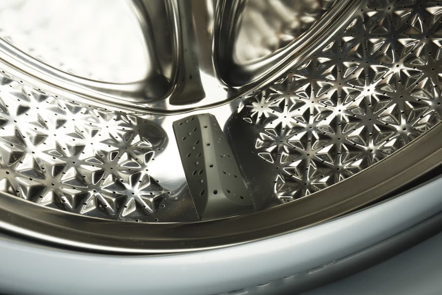 Боковые стенки барабана покрыты изнутри симпатичным узором из треугольников. Предполагаем, что такая поверхность призвана улучшать гидродинамику, способствуя перемешиванию белья. Этому же помогают и скошенные пластиковые бойники с перфорацией.