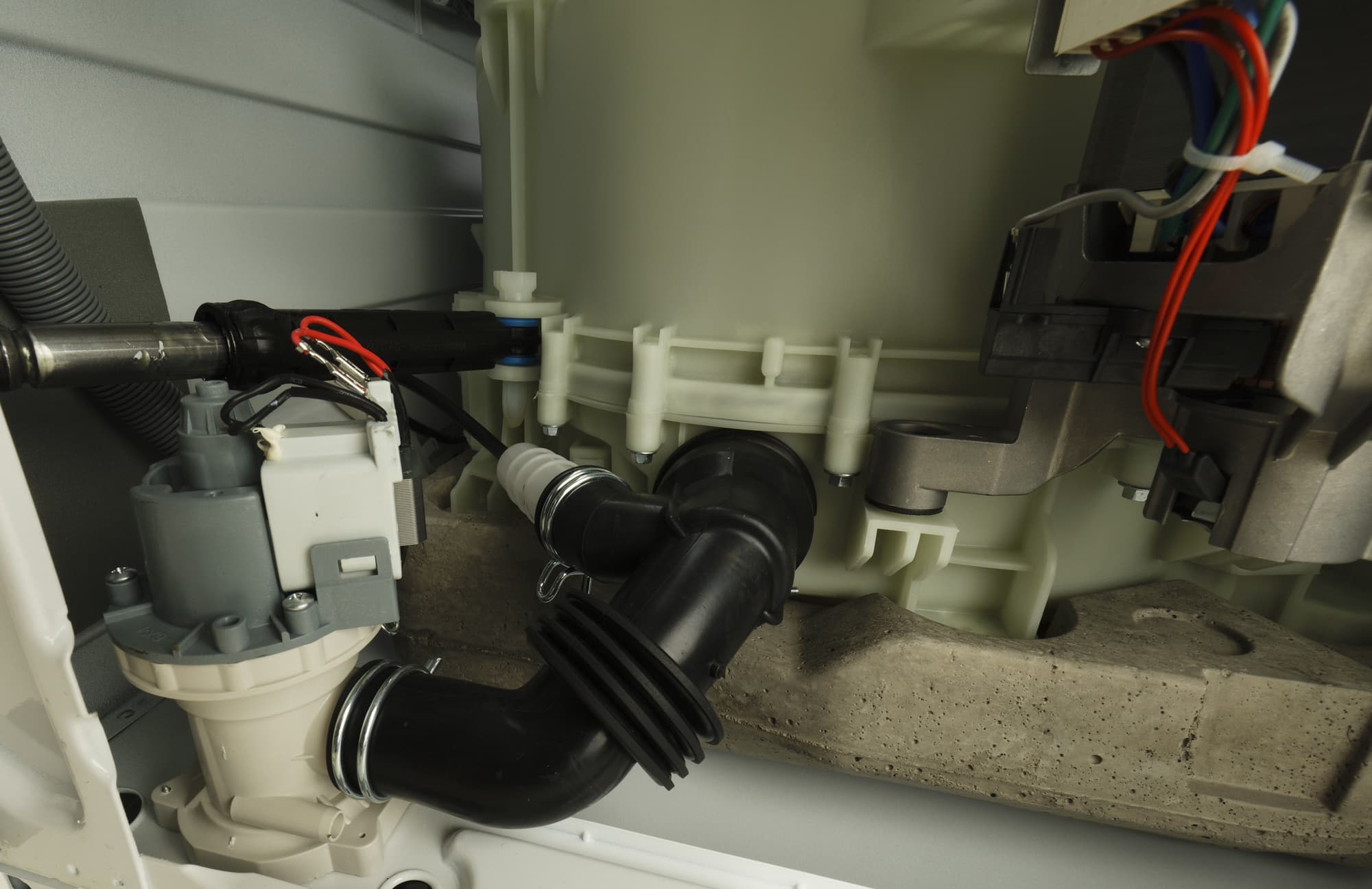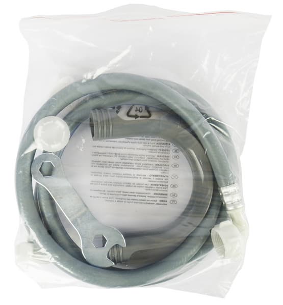 В установочный комплект входят заливной шланг несложной конструкции, четыре пластиковых заглушки для отверстий от транспортировочных болтов и стандартное U-образное «колено» для сливного шланга.