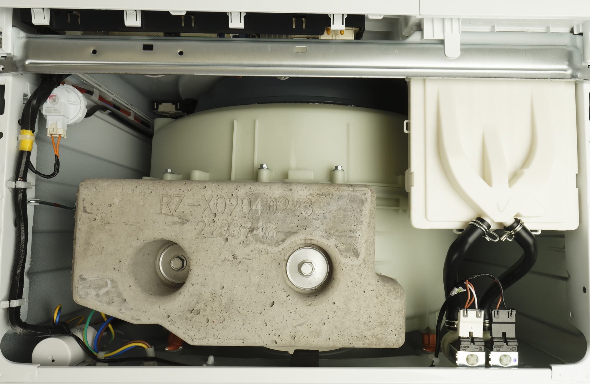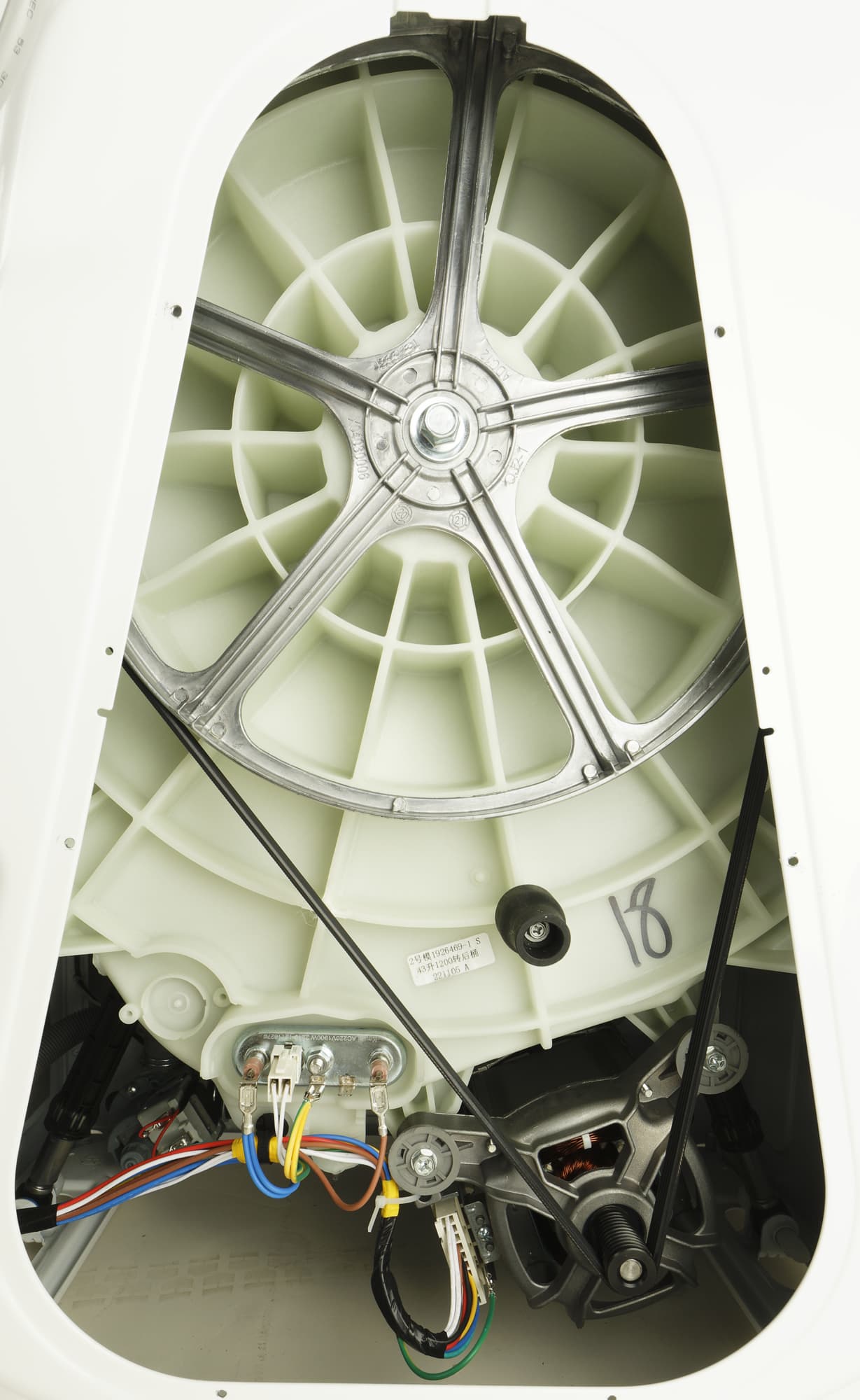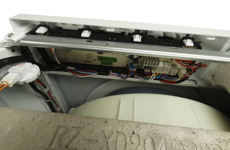 По уже сложившейся традиции мы проводим неполную разборку стиральной машины, снимая верхнюю пластиковую панель и заднюю крышку, и фотографируем агрегат изнутри.