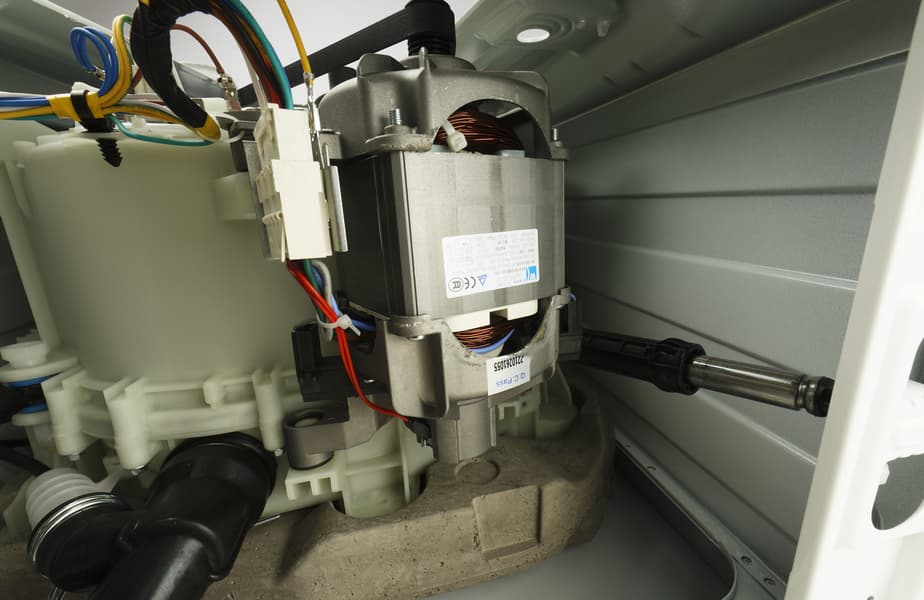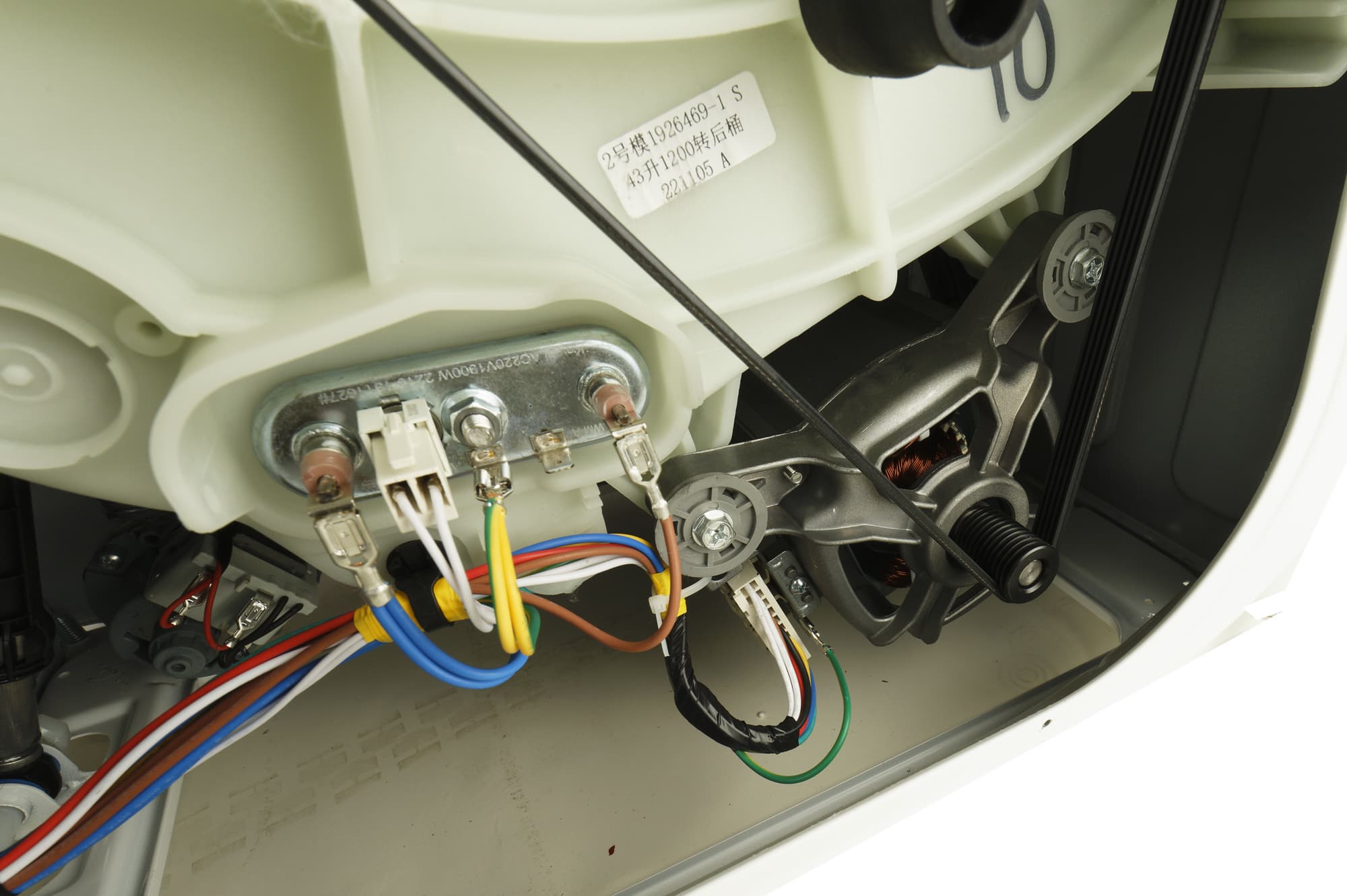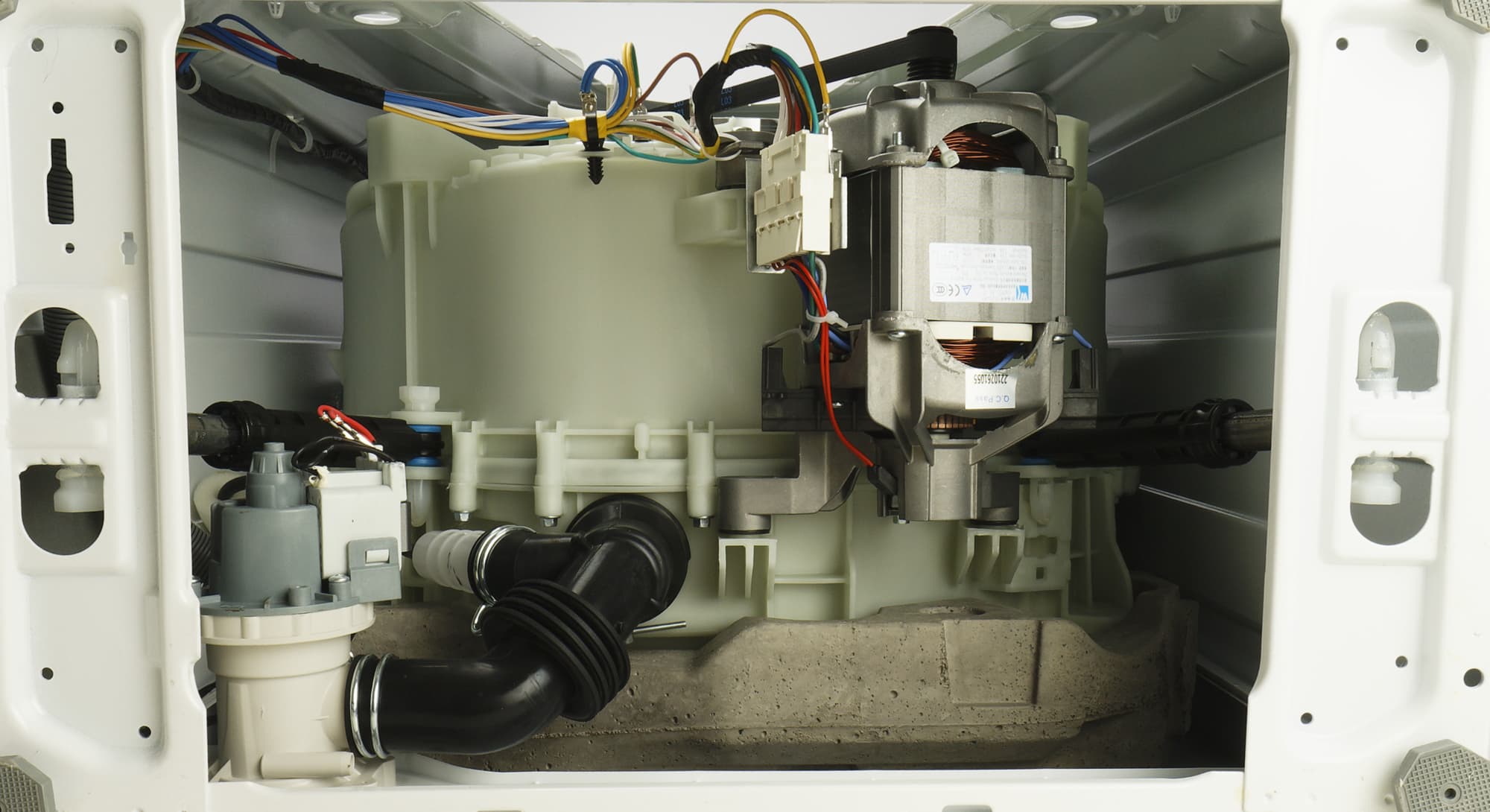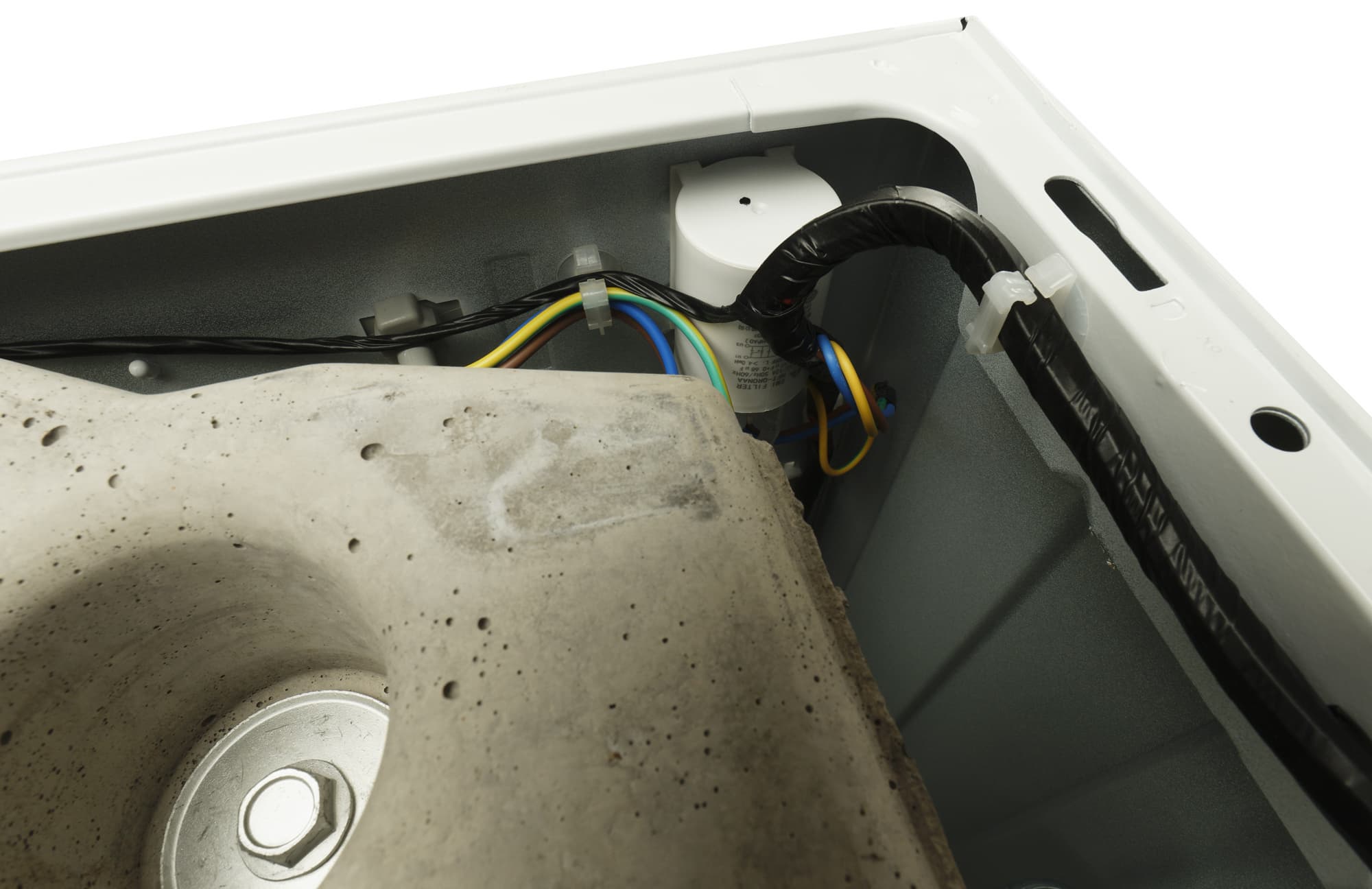 По уже сложившейся традиции мы проводим неполную разборку стиральной машины, снимая верхнюю пластиковую панель и заднюю крышку, и фотографируем агрегат изнутри.