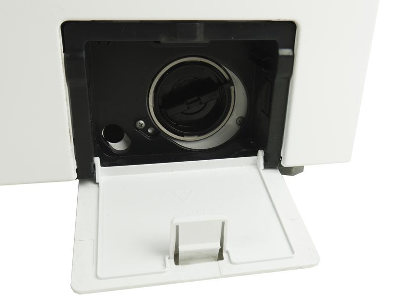 Лоток можно полностью вынуть для очистки и обслуживания, нажав на голубую защелку — она же и отметка максимального уровня кондиционера. Как и в большинстве бюджетных стиральных машин, здесь мы не видим никаких дополнительных приспособлений для жидких моющих средств.