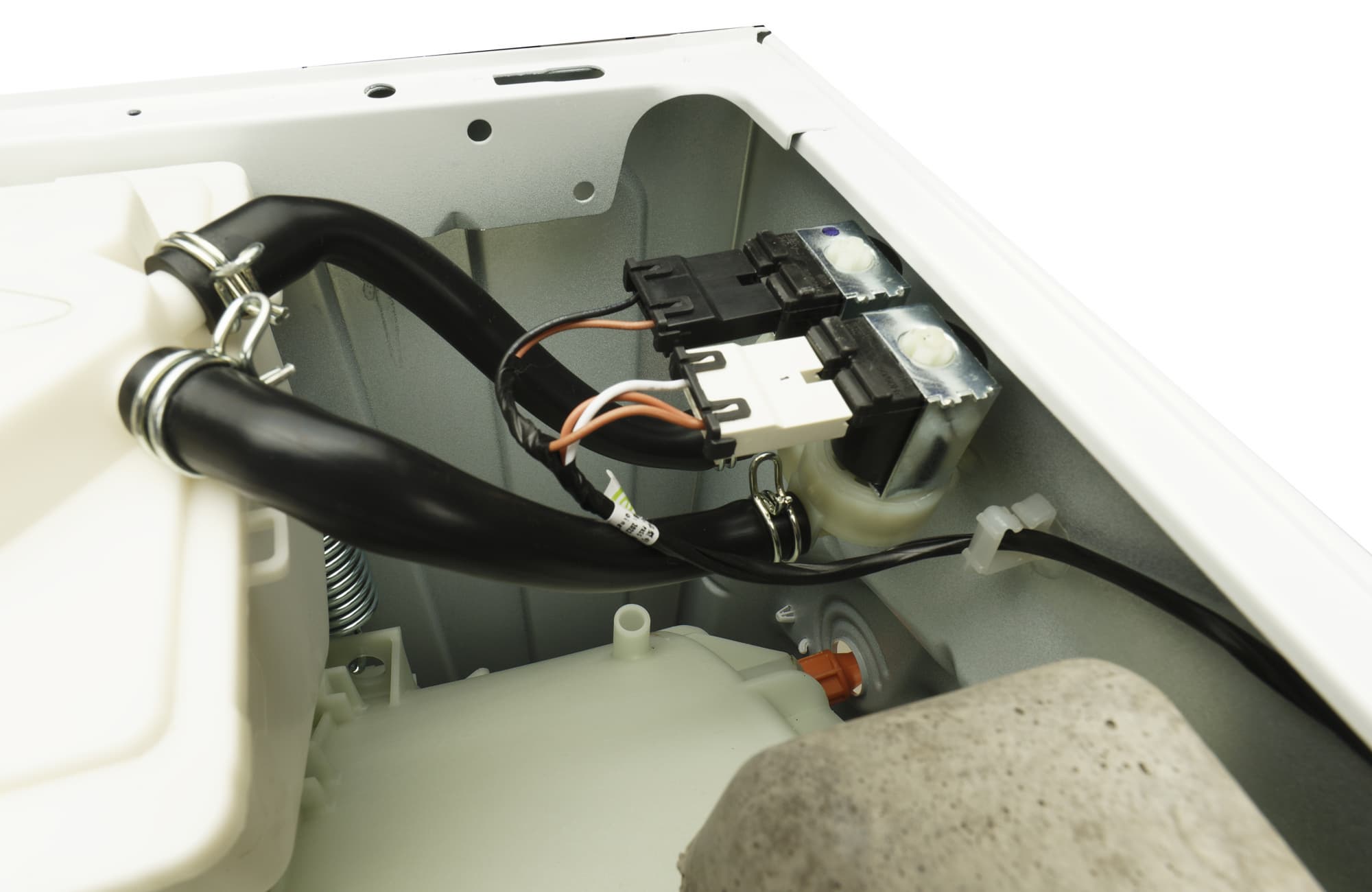 Подключение стиральной машины к коммуникациям происходит просто: заливной шланг присоединяется к водорозетке, сливной выводится в канализацию. У обоих шлангов простейшая конструкция без дополнительных элементов. Аквастопа нет.