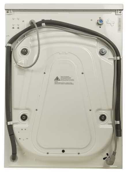 К задней стенке пластиковыми клипсами крепятся несъемный сливной шланг и электропровод с евровилкой. Заливной же шланг прикручивается к пластиковой водорозетке в правом верхнем углу. В транспортировочном положении барабан удерживается четырьмя винтами с массивными резиновыми шайбами: их перед первым включением следует вывинтить и удалить.