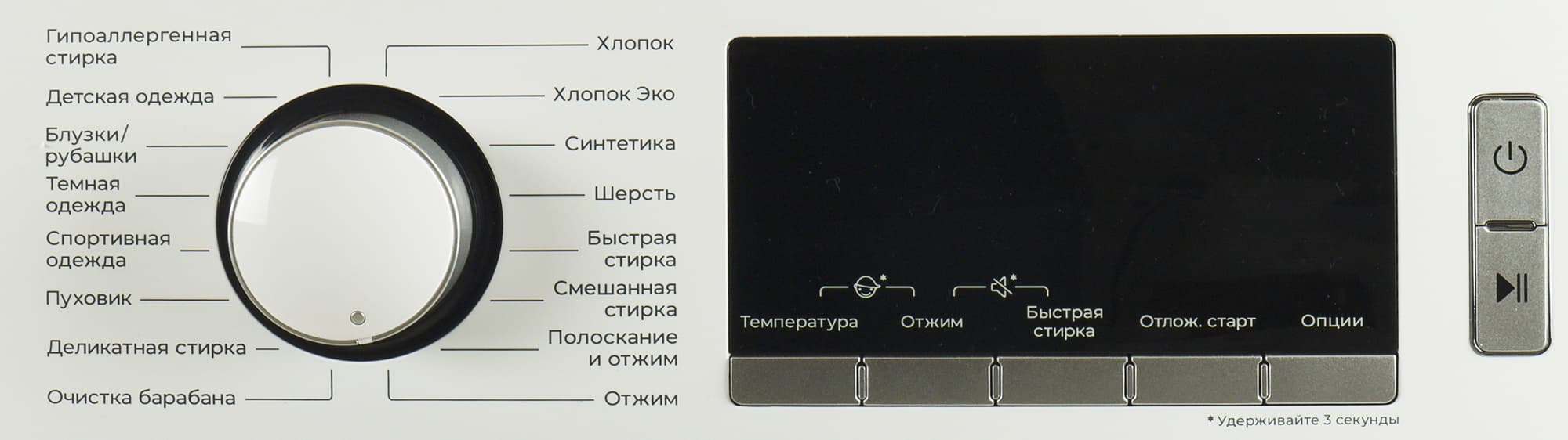 Правая часть селектора отведена для стандартных программ: здесь есть сценарии для хлопка (простой и экономичный), синтетики, смешанных тканей и шерсти. Сюда же добавлена популярная пятнадцатиминутная программа.