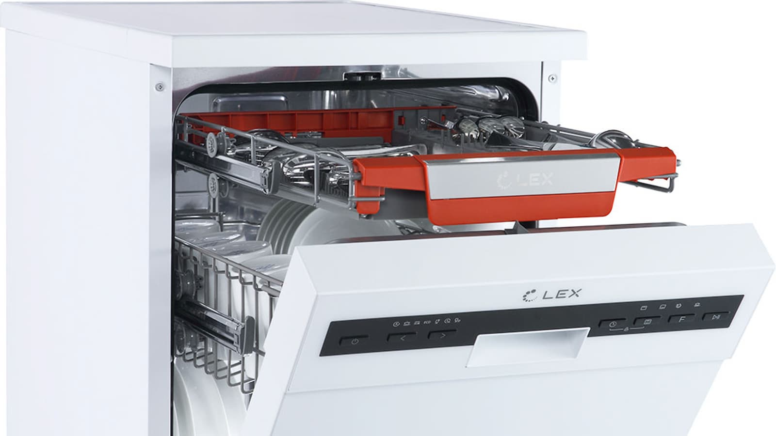У Lex DW 4573 WH три корзины. Нижняя, как обычно, предназначена для больших тарелок, кастрюль, сковород и разделочных досок, средняя — для десертных тарелок, чашек, блюдец и бокалов. На верхнюю выдвижную полку надо класть столовые приборы.