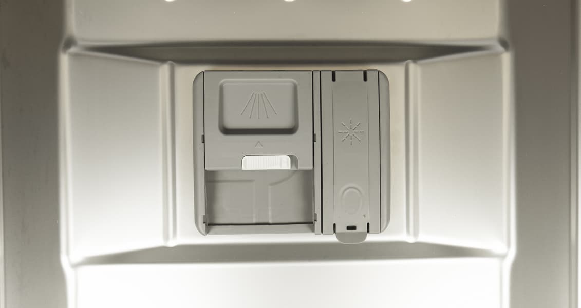Конструкция блока тоже вполне стандартная: слева под сдвижной крышкой находится квадратный отсек для порошка или таблетированных средств, а за откидной задвижкой скрывается резервуар для ополаскивателя.