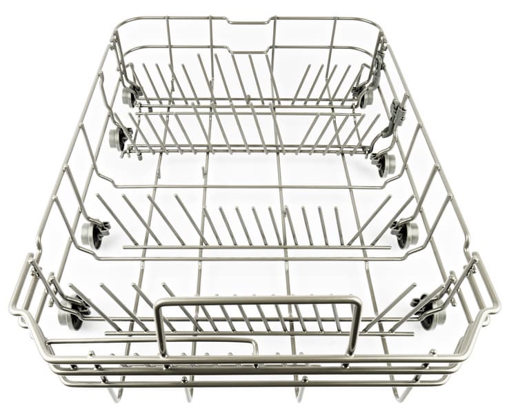 У нижней корзины — два ряда держателей. Передний — неподвижный, а задние направляющие могут складываться. Это позволяет без труда разместить здесь крупные предметы: кастрюли, большие миски и сковородки. Опирается конструкция на восемь пластиковых роликов, скользящих по выпуклым «рельсам» в корпусе.