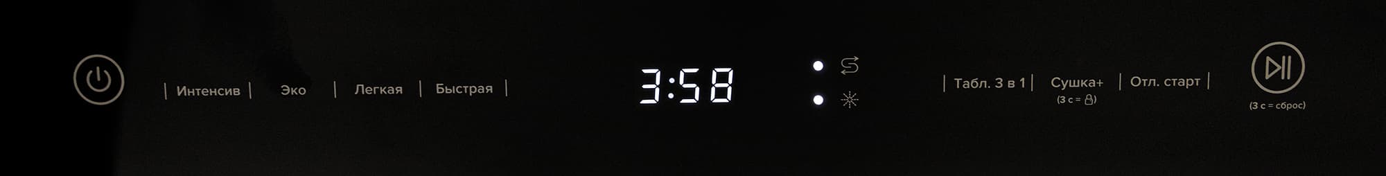 По центру расположен дисплей с крупными яркими символами. На нем в процессе мытья отображается обратный отсчет времени программы, либо код ошибки в случае каких-либо неполадок.