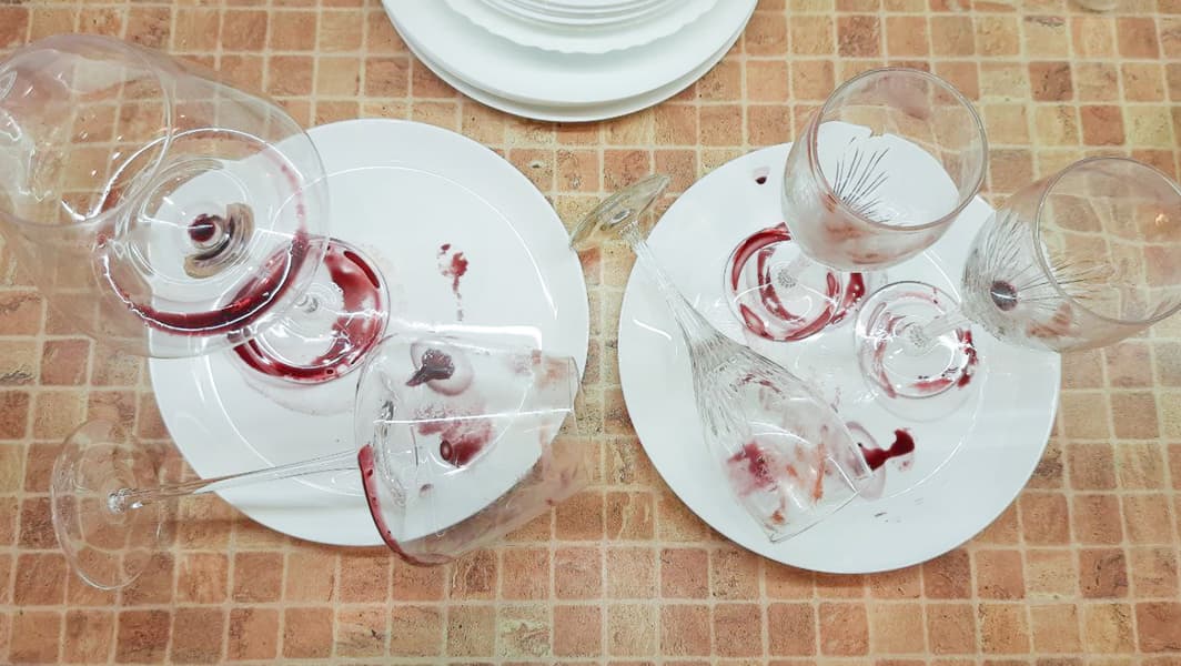 Назовем это имитацией бурной вечеринки, когда хозяева далеко не сразу вспомнили о грязной посуде — на стекле бокалов жирная помада, красное вино внутри и снаружи, и всё это сохнет в течение суток.