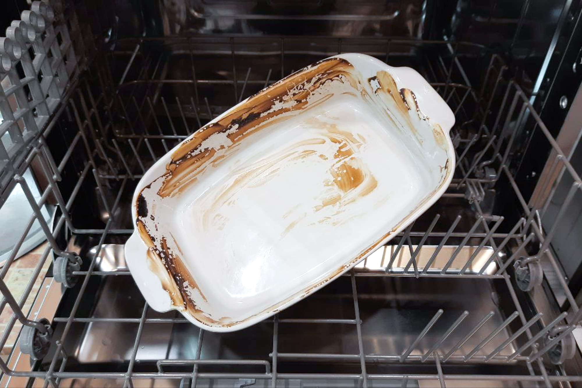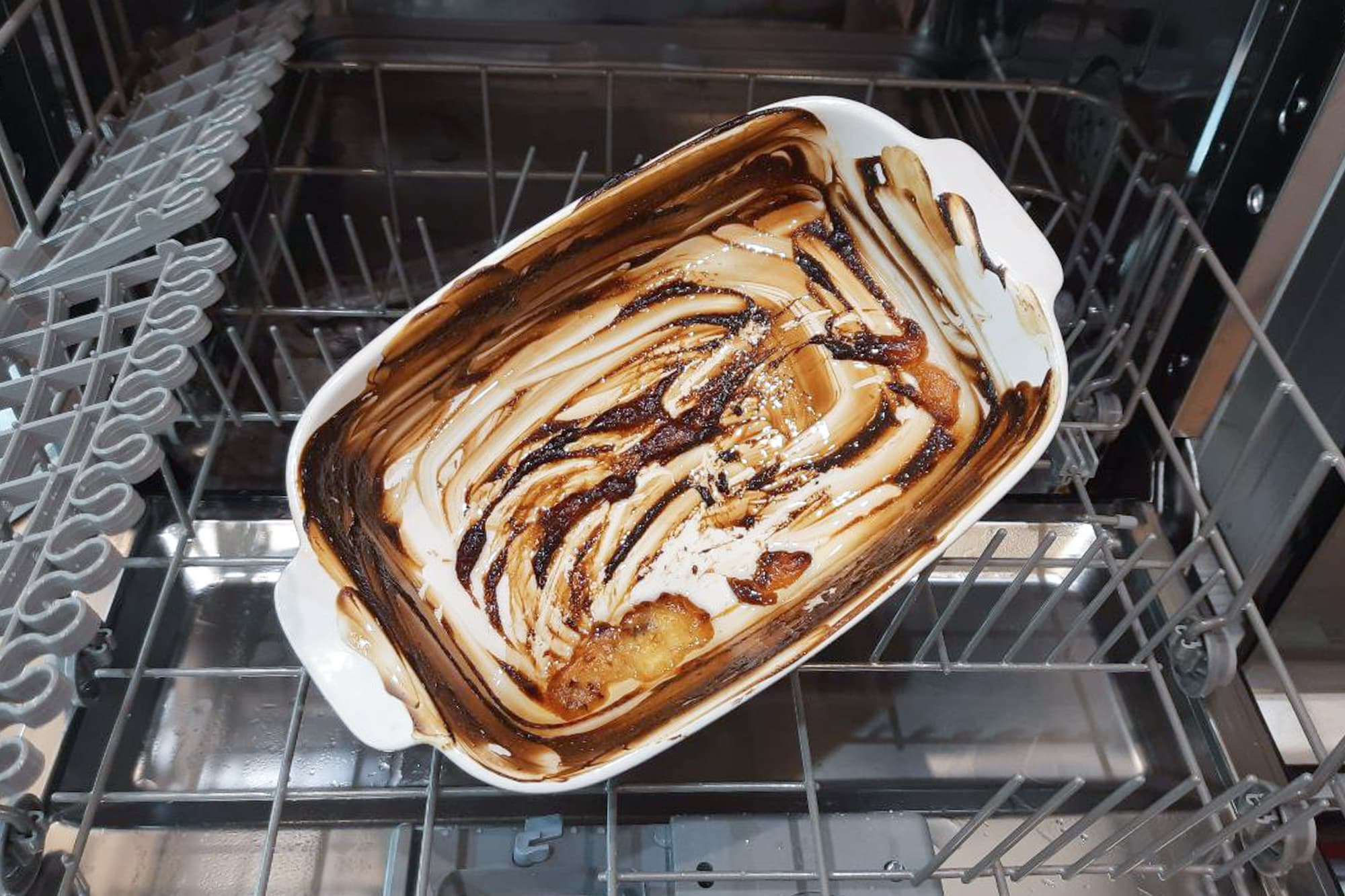 Напоследок у нас, как обычно, задание со звездочкой — керамическая форма, в которой запекалось жирное мясо в сметанном соусе. После опустошения емкости поставили ее в духовку на 15 минут в режиме Гриль и оставили на сутки подсохнуть. В обычной жизни мы бы, конечно, сначала замочили посудину на пару часов, но цель была максимально усложнить задачу и выяснить пределы возможностей устройства. Так что мы просто поместили емкость вверх дном в середину корзины и запустили посудомойку.