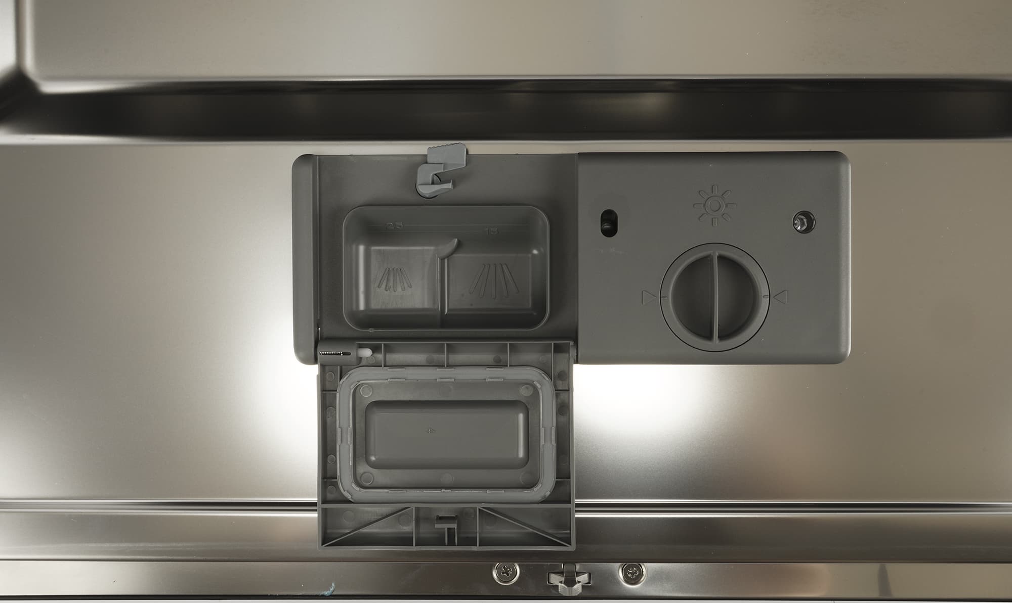 Состоит он из двух отсеков: слева за откидывающейся крышкой — отсек для порошка или таблеток, справа — пробка емкости для ополаскивателя, под которой прячется регулятор расхода средства.