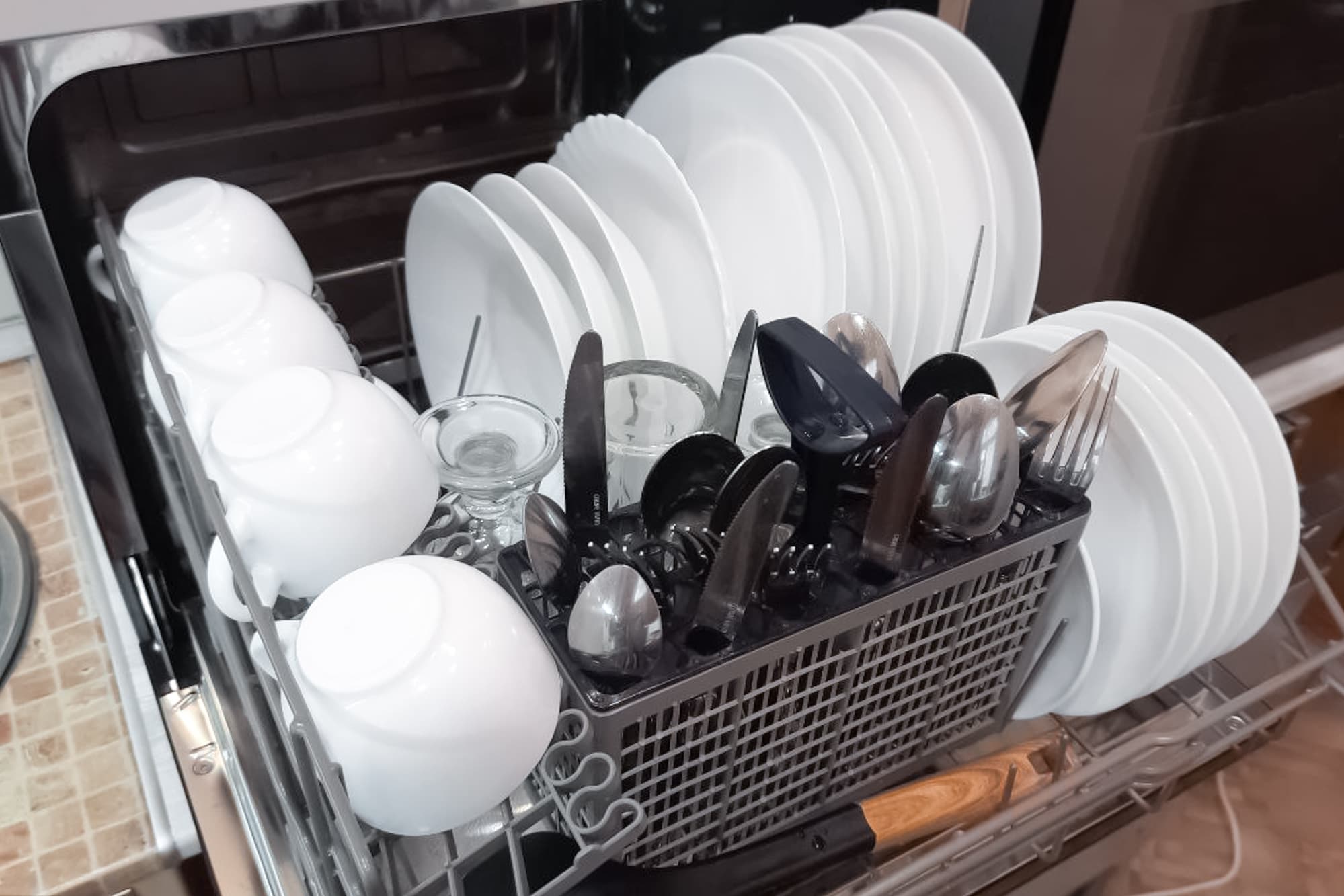 Слева у дальней стенки есть дополнительные упоры, подходящие как для крупных, так и для мелких тарелок или блюдец. Такие же упоры находятся справа спереди. Слева спереди остается пространство, которое можно использовать для размещения лотка со столовыми приборами, нескольких крупных кружек или пиал. Слева на бортике корзины закреплены складные полочки с держателями для бокалов, которые предполагается устанавливать под небольшим наклоном. На полочках можно размещать небольшие чашки. Лоток для столовых приборов выглядит традиционно. Крышка с отверстиями позволяет аккуратно расставить в лотке вилки, ложки и ножи или, убрав элемент полностью, сложить их кучей.