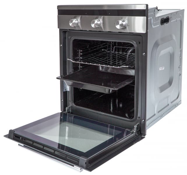 Большой внутренний объем 55 литров быстро нагревается и долго удерживает тепло. Комплектация из решетки и глубокого противня позволяет готовить сразу на двух уровнях из 5 возможных. Энергопотребление духовки не превышает 2 кВт, поэтому прибор можно встроить практически в любую кухню.