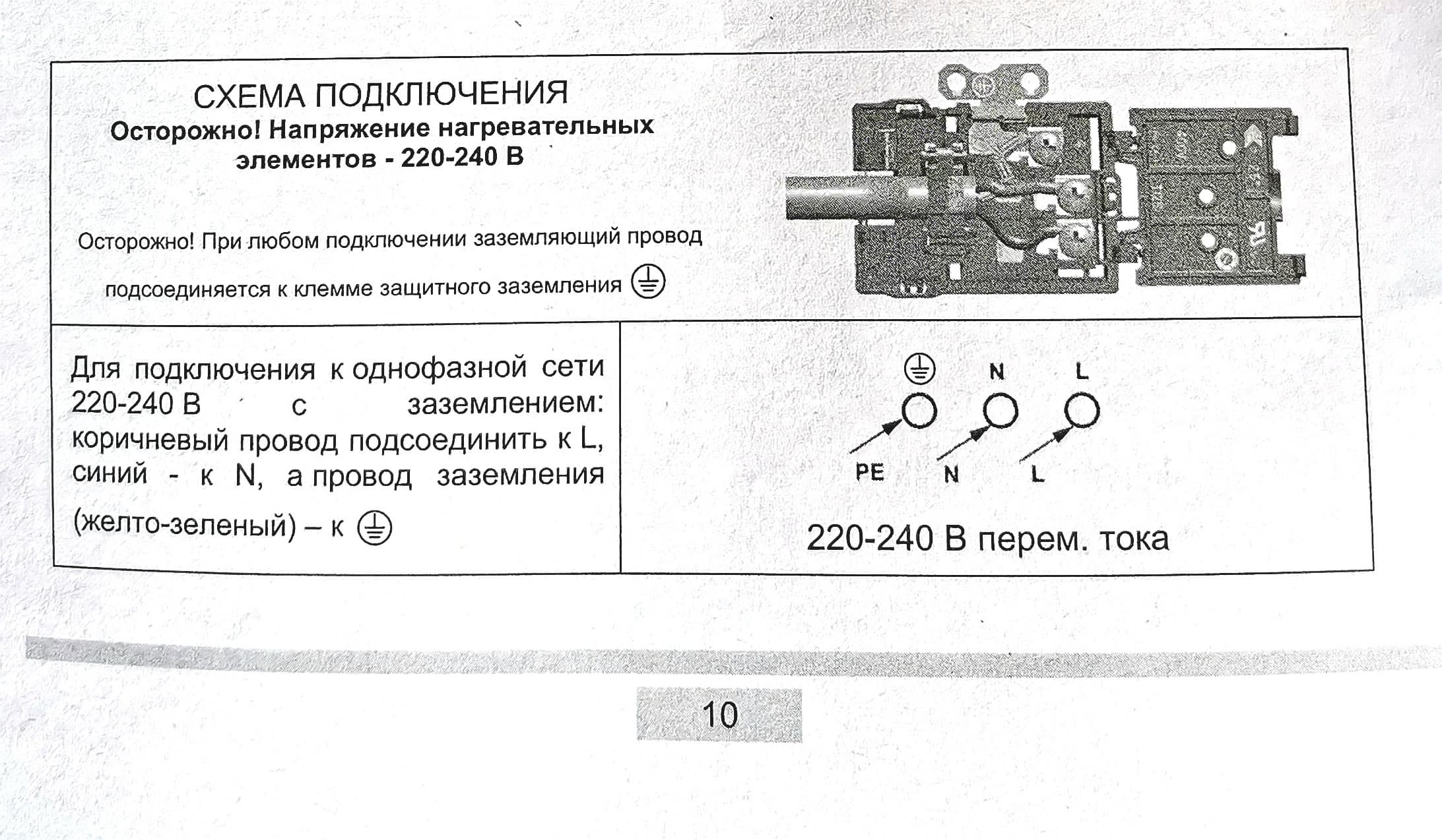 Духовой шкаф рассчитан на работу от однофазной сети переменного тока (220—240 В / 50 Гц). Духовка оборудована выходящим из задней стенки кабелем длиной около 1 м с тремя жилами стандартной расцветки, провод многожильный, обжат гильзами. Схема подключения находится на крышке соединительной коробки. Кабель должен соответствовать по типу и номинальной мощности, а также быть надежно зафиксирован в кабельном зажиме. Линия электропитания должна быть оснащена защитным выключателем для прекращения подачи питания в случае неполадок.