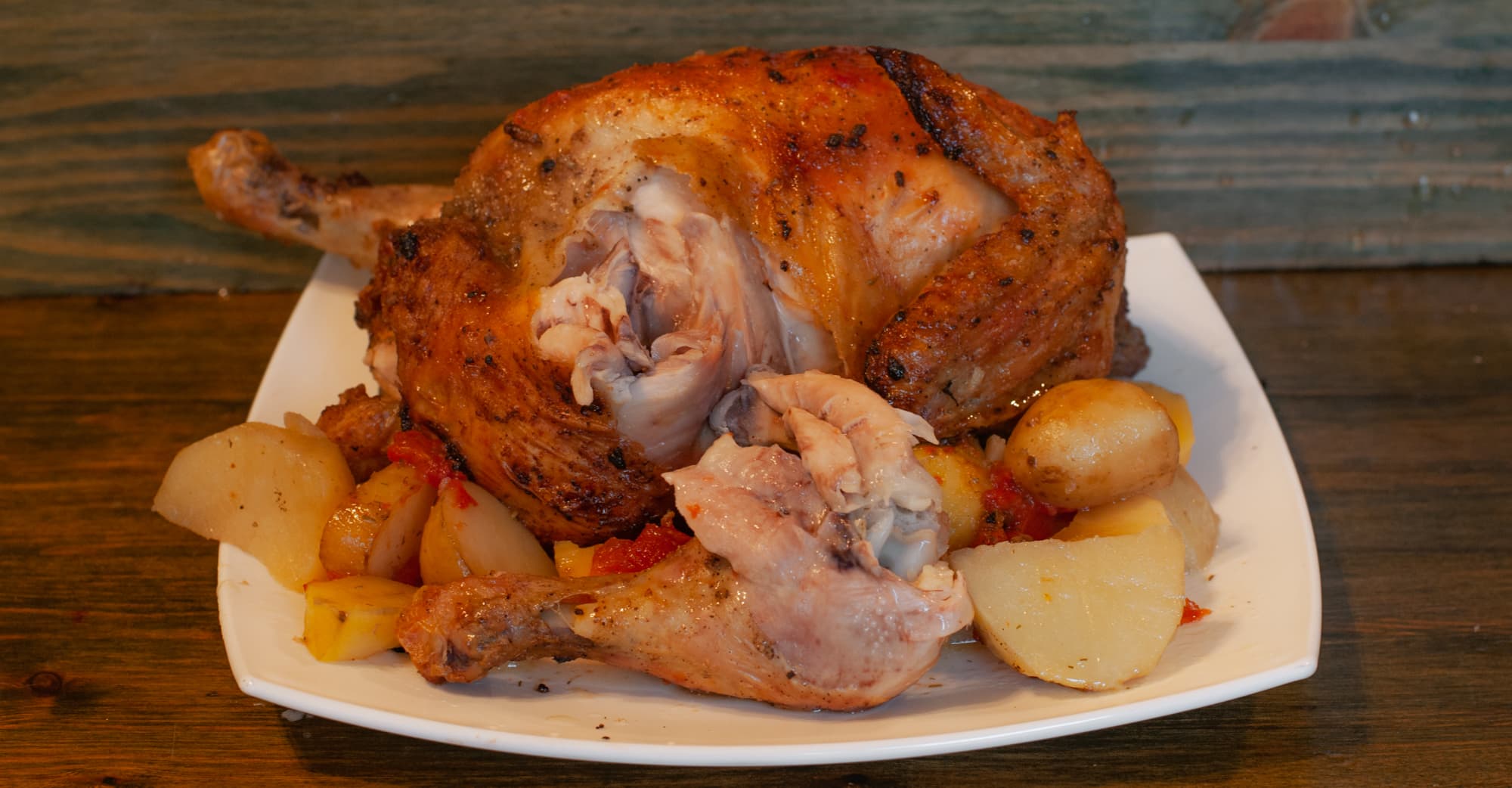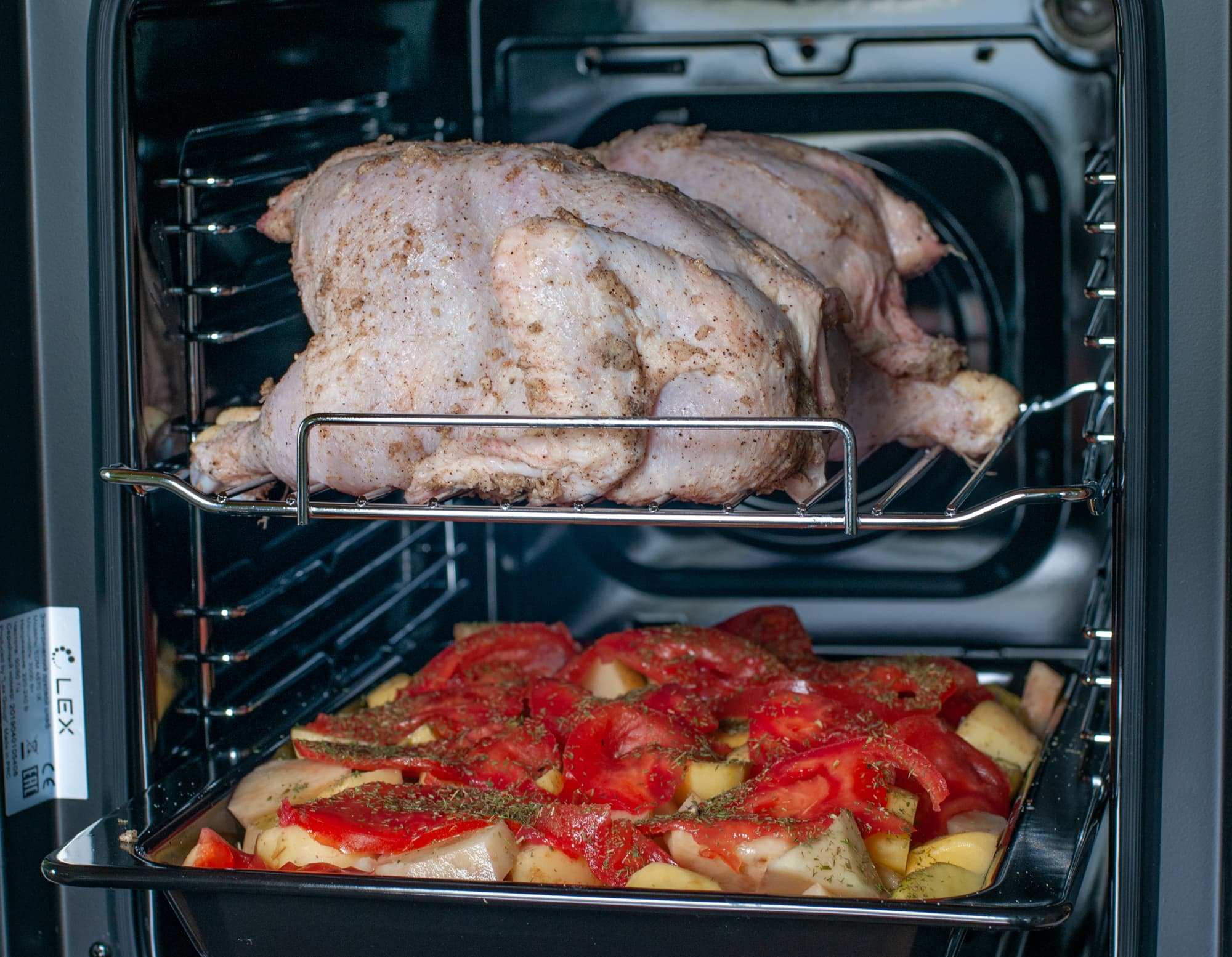 Мы взяли две большие курицы, общим весом 3,8 кг, натерли солью с чесноком и перцем. В глубокий поддон положили картошку, нарезанную крупными кусками, и помидоры. Поместили решетку и поддон в духовку, выставили режим гриля, температуру 210 °C, таймер на 2 часа.