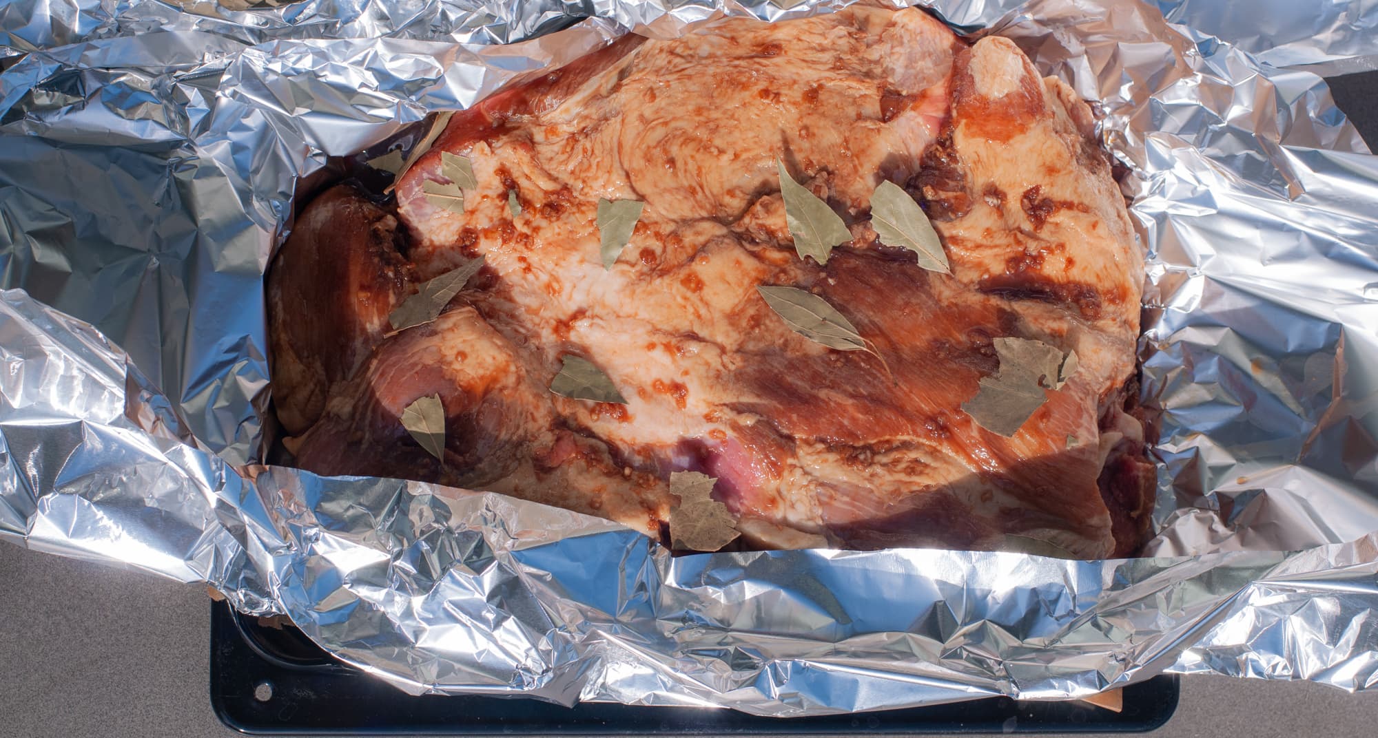 Мы взяли свиную шею весом 4,5 кг, промаринованную в специях и соевом соусе двое суток. Переложили на фольгу в глубокий противень, обернули.
