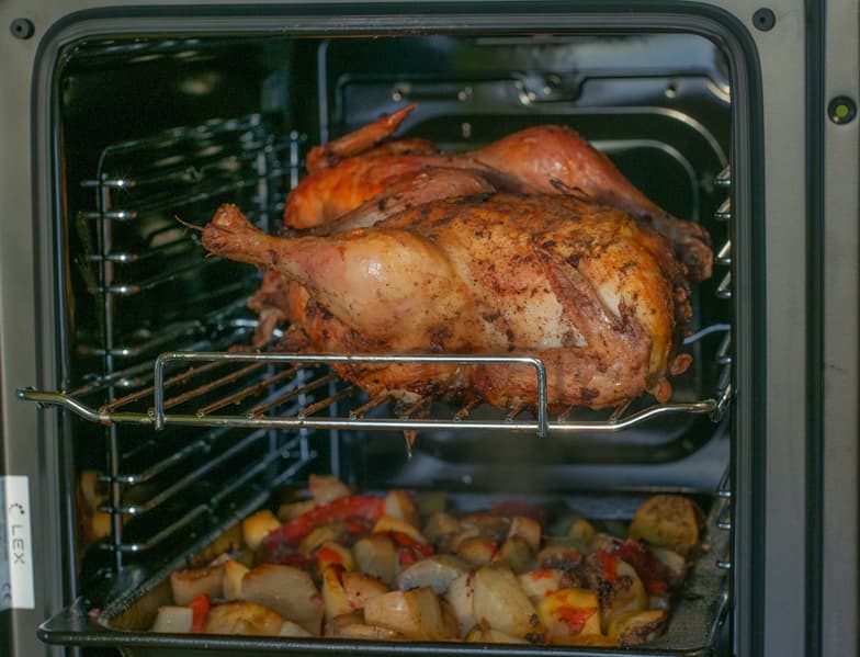 Примерно через полчаса курица подрумянилась сверху. Мы перевернули ее, включили режим конвекции с нижним и верхним нагревом. Держали до готовности.