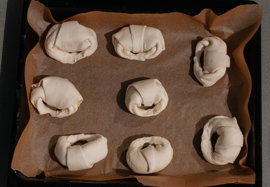 Мы взяли упаковку замороженного слоеного теста средней ценовой категории и лимонное повидло. Тесто разморозили. Сформировали рогалики с повидлом внутри, поставили в заранее прогретую духовку.