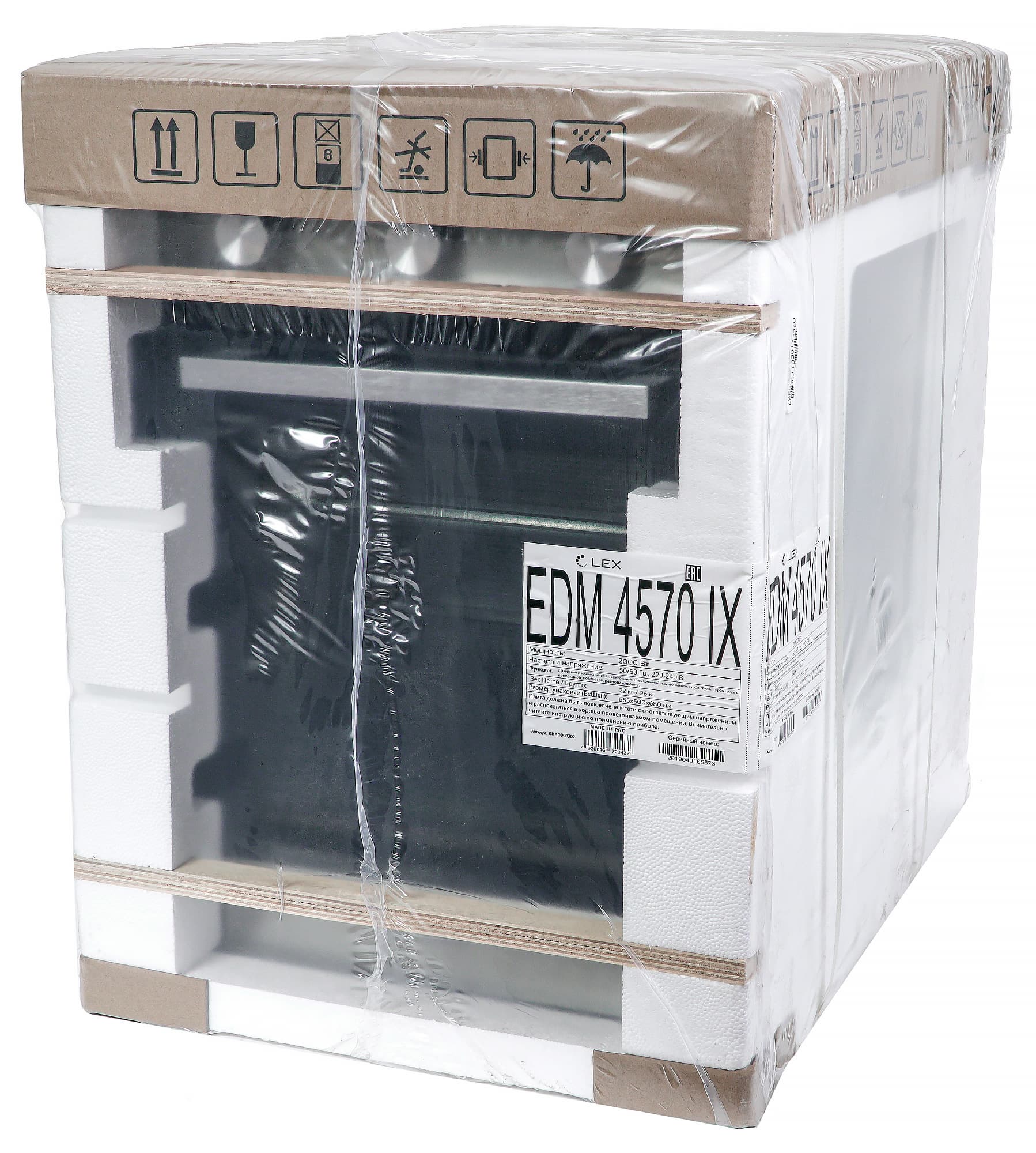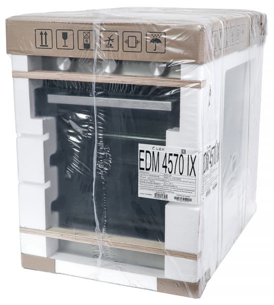 Духовой шкаф прибыл на тестирование надежно упакованным в пенопласт, усиленный деревянными элементами, и обернутым в полиэтиленовую пленку. Верхняя часть дополнительно защищена вставкой из картона с нанесенной информацией: транспортировочными пиктограммами и названием модели.