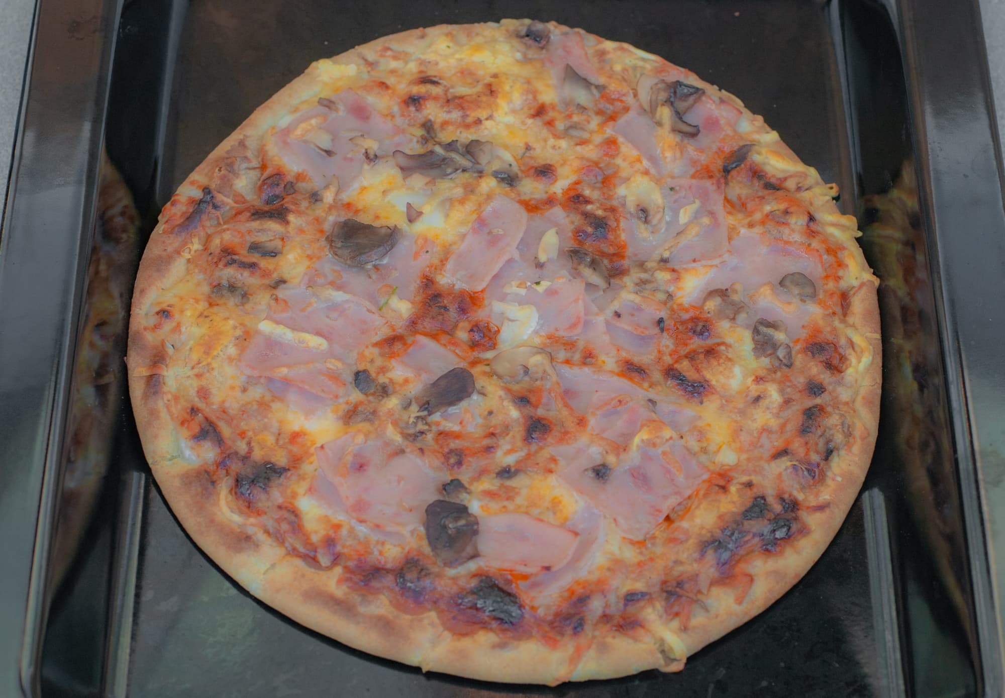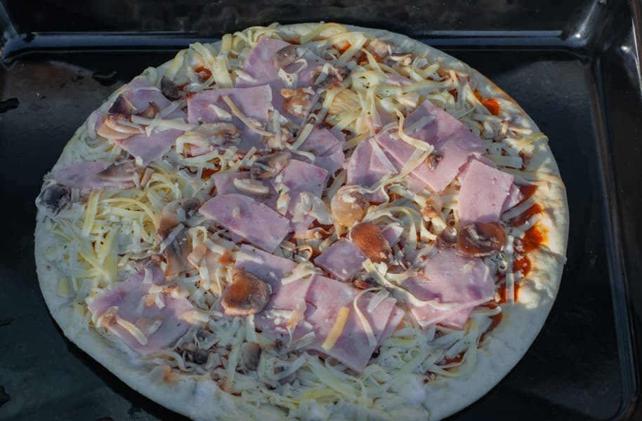 Мы взяли замороженную пиццу с грибами, выложили на противень и разморозили в духовке в режиме «разморозка». После этого выставили режим усиленного гриля + конвекция.