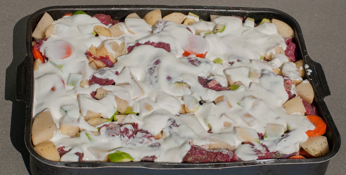 Овощи почистили, порезали произвольно, смешали с мелко нарезанной сырой говядиной. Выложили в большую глубокую емкость, залили сметаной.