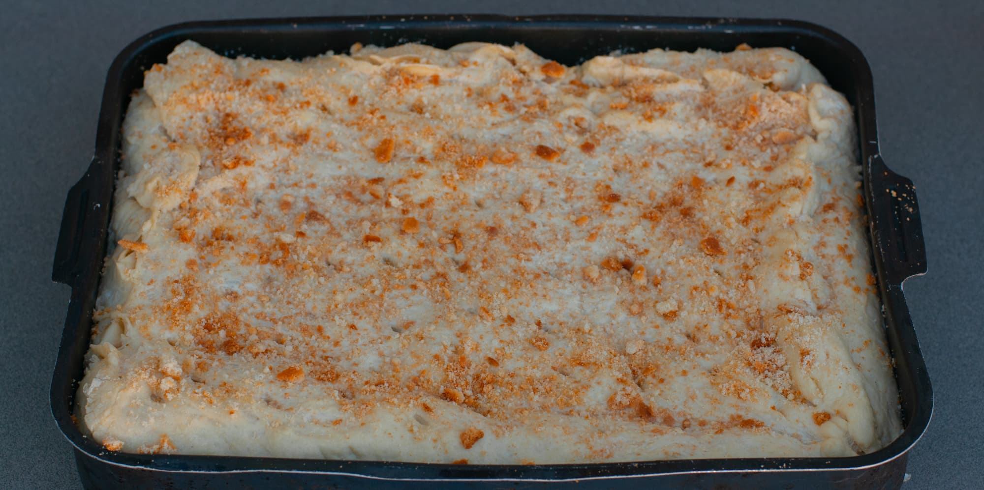 Через пару часов вынули, прогрели духовку до 200 °C, поставили емкость на решетку, выставили конвекцию с верхним и нижним нагревом, и таймер на 45 минут.