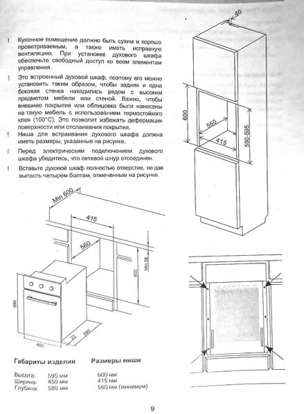 Требования по установке духового шкафа подробно описаны в инструкции. Это хорошо проветриваемое помещение с исправной вентиляцией, свободный доступ ко всем элементам управления и использование термостойкого клея для покрытий, находящихся рядом с духовкой. Габариты установочной ниши показаны на чертеже в инструкции.
