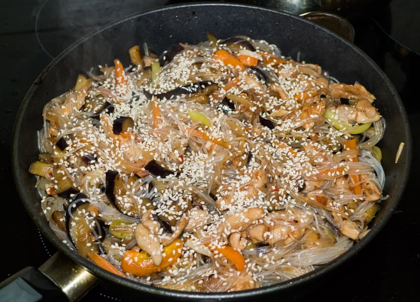 Сняли его со сковородки и поместили туда лук. Когда он немного подрумянился, добавили морковь, перемешали и через минуту всыпали кусочки баклажанов. Спустя небольшое время, туда же пошла соломка болгарского перца и мелко нарубленный чеснок. В заключение вернули в сковороду куриное филе и отваренную на соседней конфорке фунчозу.