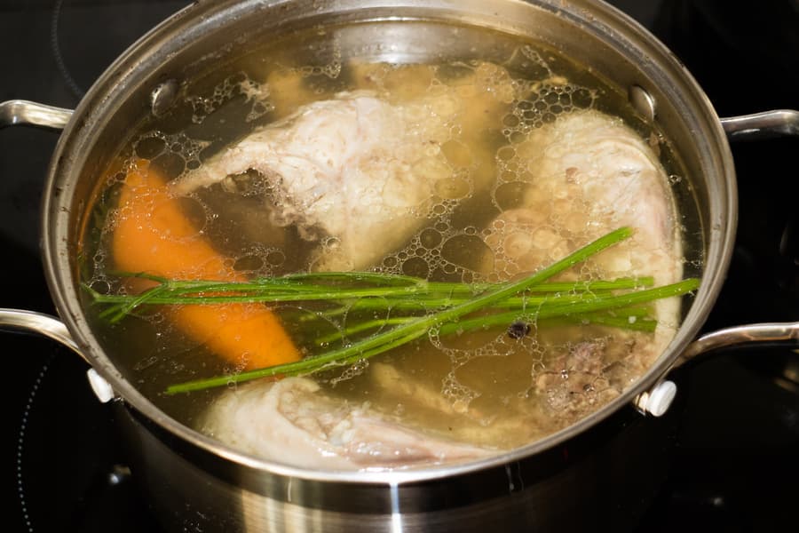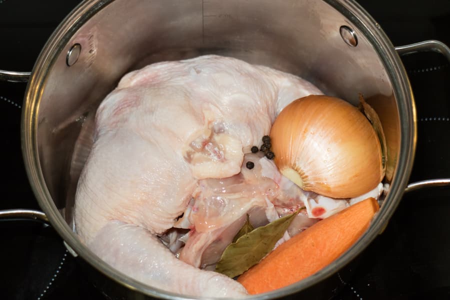 Срезали с хорошей алтайской курицы грудку и поместили тушку в трехлитровую кастрюлю, добавили половину луковицы и морковку, горошины черного и душистого перца, соль и лавровый лист. Залили все это богатство водой и поставили на малую конфорку.