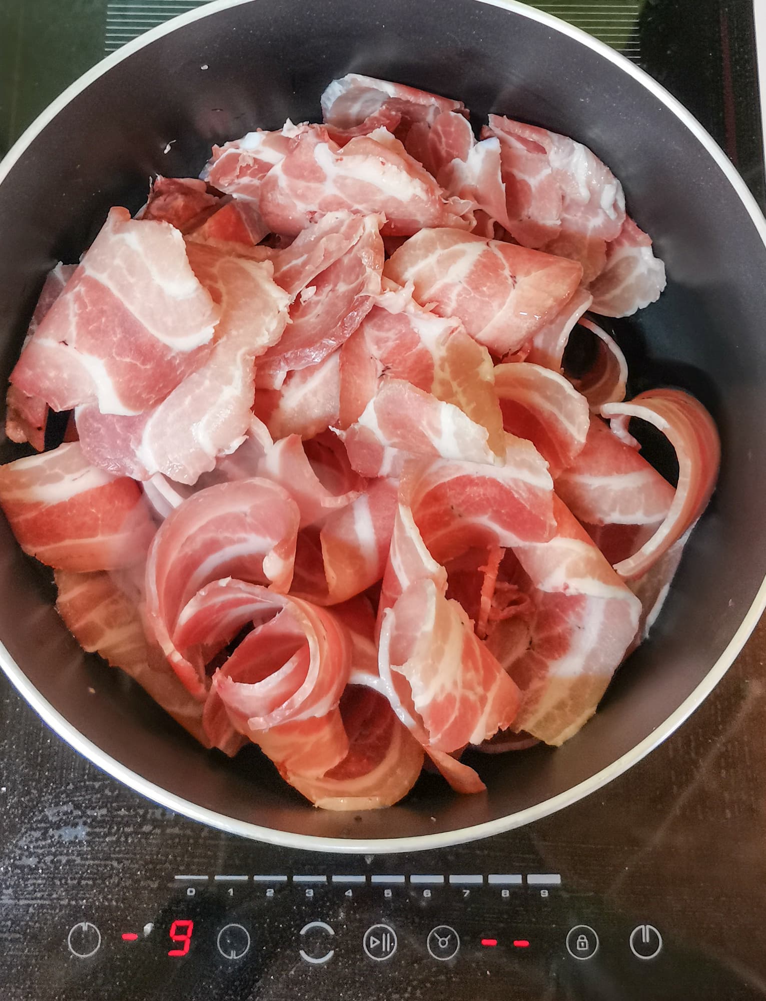 Получился отличный вкусный бигус, хотя бекон и развалился на мелкие кусочки.