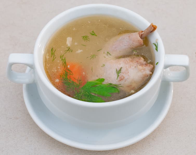 В кастрюлю на 6,5 л положили несколько куриц-корнишонов, залили водой и поставили на плиту в режиме слабого нагрева. Выставили таймер на 1,5 часа. Через 1,5 часа добавили в бульон морковь, корни петрушки и зелень.