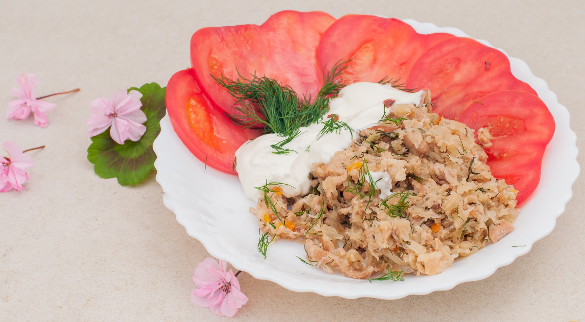 Уложили сверху квашеную капусту со специями, долили воды, выставили мощность и таймер. Тушили на режиме 4 в течение 2 часов.